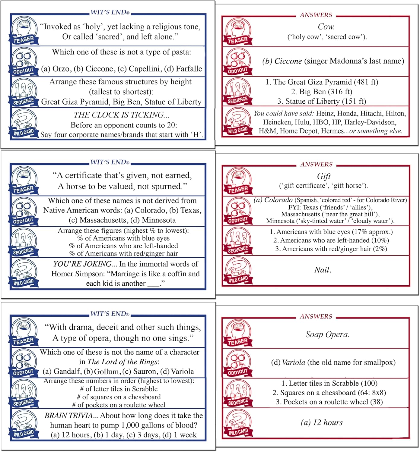 - All categories are packed with a mix of jaw-dropping history, mind-boggling science, expansive geography, pop culture mysteries, current affairs conundrums, and tricky riddles. Each question card will keep you guessing what you'll get next.