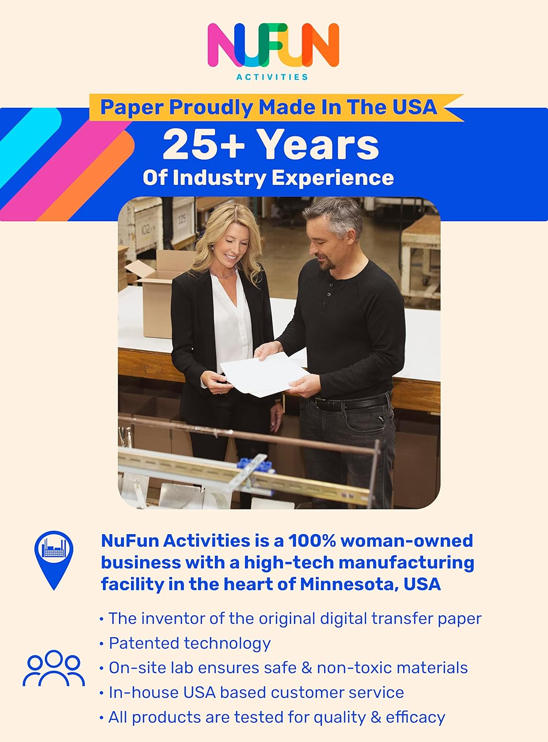 NuFun Activities Printable Iron-on Heat Transfer Paper for T Shirts, Light Fabrics, 100 Sheets 8.5 x 11 inch, Long Lasting, Durable, Professional Quality, Easy DIY, Non-Toxic, Made In the USA