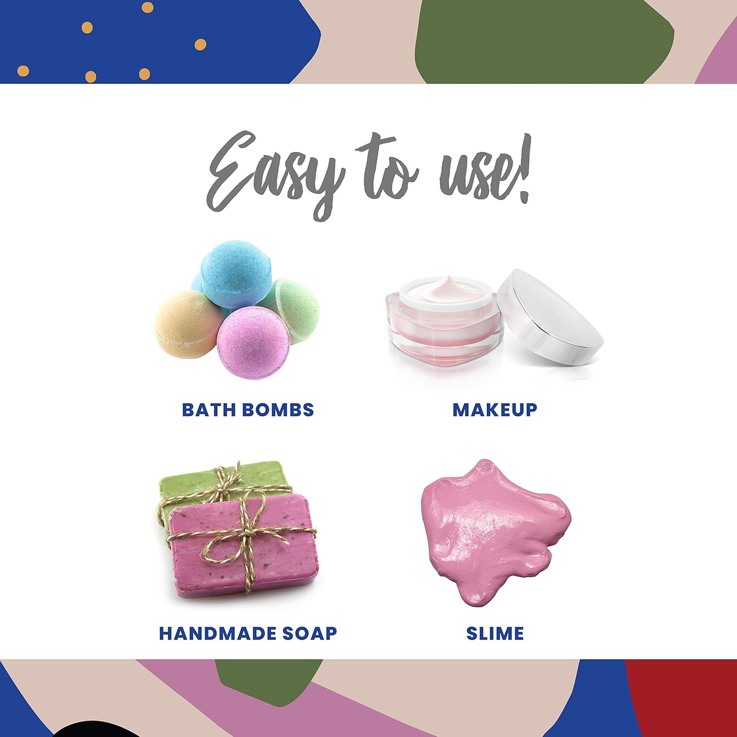 - PREMIUM COLORANT SET - Includes eight amazing 100% natural colorants packed in small stand-up pouches. Large amount of colorant; 0.25 oz (7 g) of each color. Colorant dyes are cosmetic-grade, skin safe and non-toxic. Use for soap making, bath bombs, candle making, makeup, lotions, lip balms, resin, cosmetics, slime and diy craft projects.