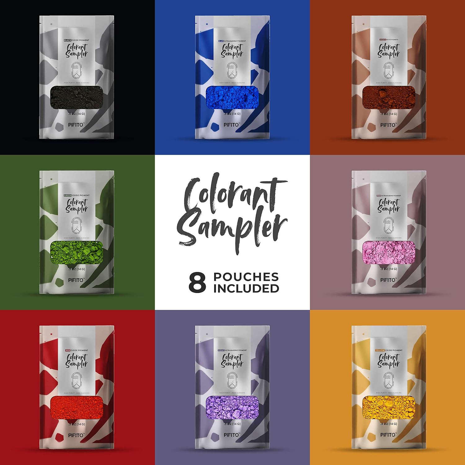 - CONTENTS INCLUDED - The professional soap maker’s favorite choice; kit of 8 pouches, 0.25 oz each of the following pigment colorants: Red, Blue, Yellow, Pink, Green, Brown, Black and Violet (purple). Colors are non-bleeding and come in a matte finish.