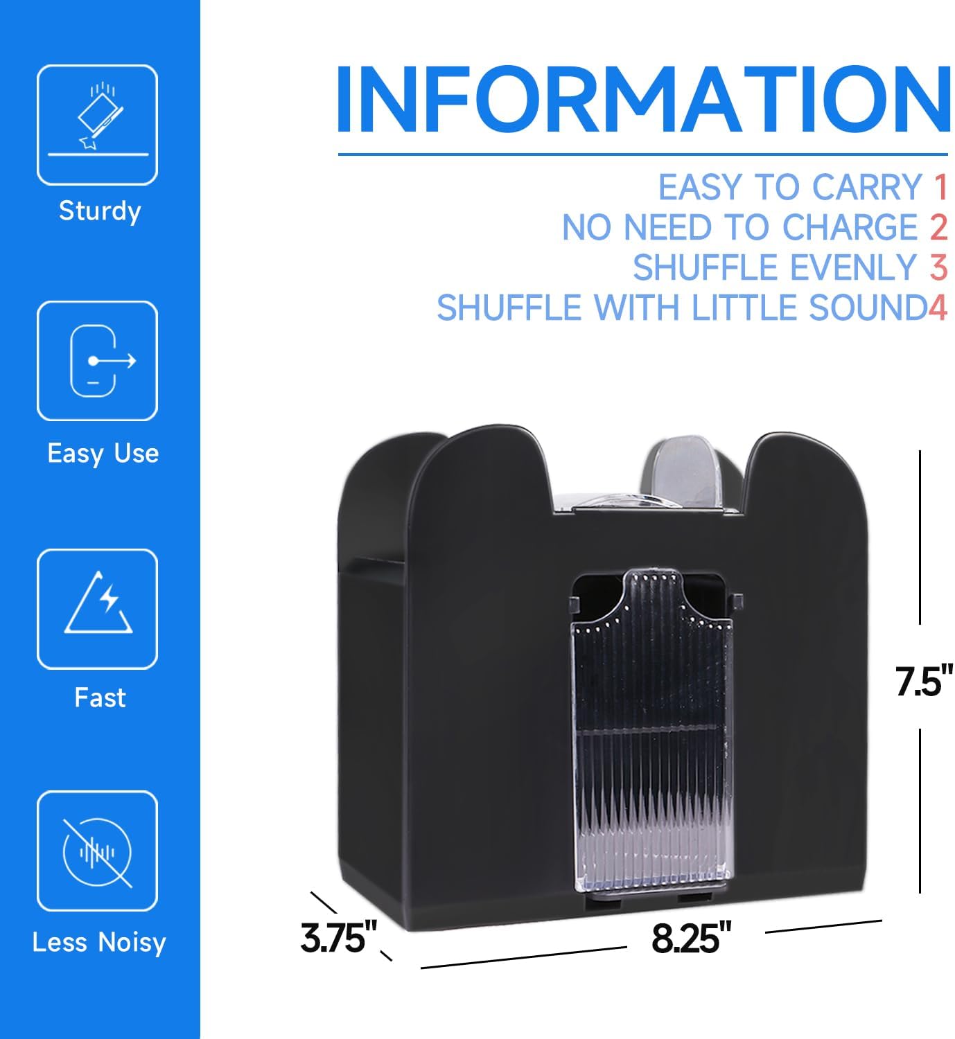 - Automatic Card Shuffler: Just insert the cards into the two openings, and press the switch at the bottom of the card shuffler, with the machine shuffling quickly and efficiently; shuffles one to six decks of playing cards in seconds, save your time; the shuffler dimensions are 8.25" L x 3.75" W x 7.5" H