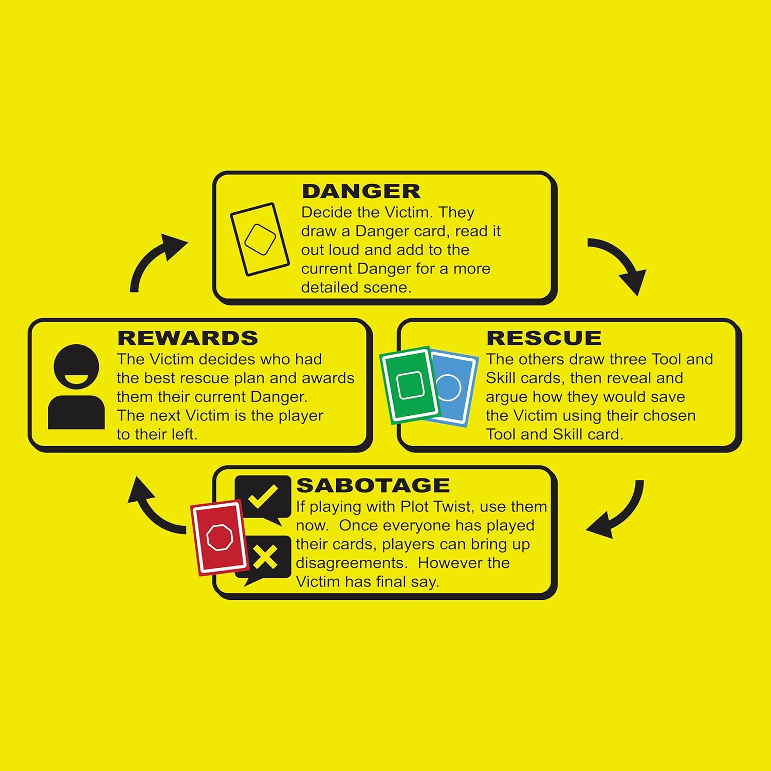 - Use your skills, tools, and imagination to devise a foolproof plan to save the day. Compete to convince the Victim your rescue plan is best.