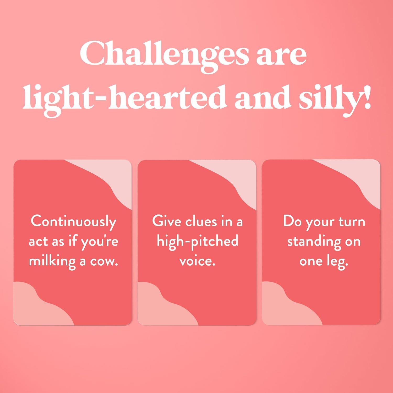 - ๐ DO SILLY CHALLENGES: Slow down the other team by making them do addiitonal challenges while giving clues such as "talk in a British accent" or "act like you're milking a cow."