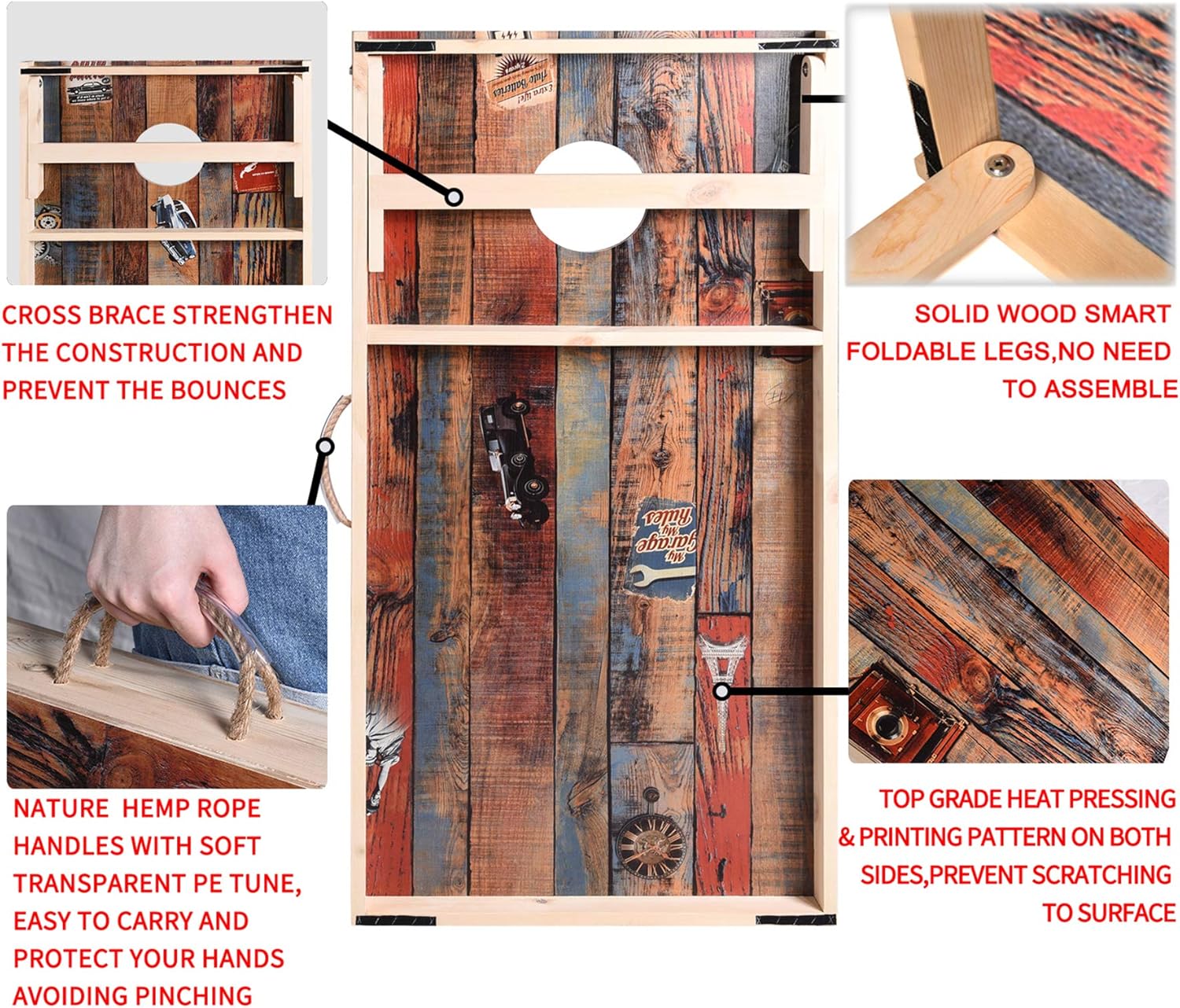- DURABLE SOLID WOOD CONSTRUCTION: This cornhole set is constructed of 100% solid wood frame, one solid wood cross brace is between the foldable legs, another is in the middle of the cornhole board, two braces ensure it to be sturdy and strong enough to prevent warping and bouncing. Clear varnish is finished with the boards to protect them for years.