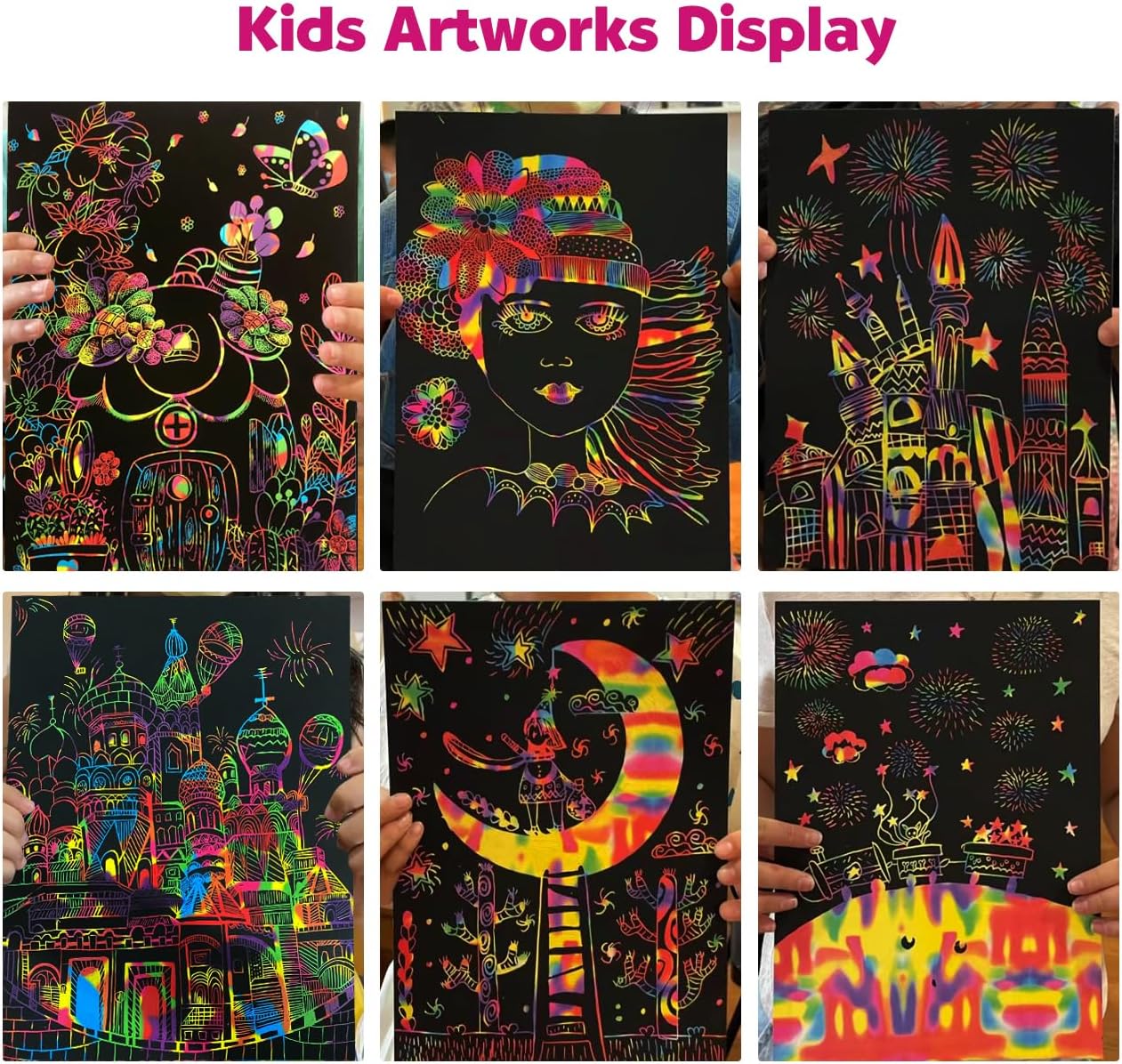 - Fun Scratch Art for Kids - The art supplies kit include 50 Sheets magic scratch paper & 5 Wooden Stylus & 4 colorful stencils & 1 brush. Ideal for classroom scratch art party activities.Perfect travel toys & car games for kids.