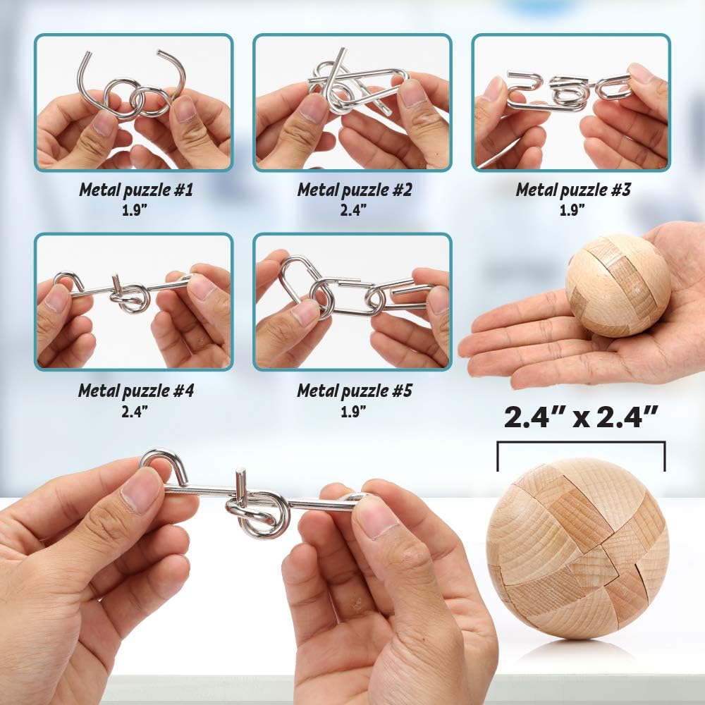 - Brain Teasers Puzzle 6 Set For Kids, Adults- All the coils and blocks are smooth and have NO SHARP EDGES for endless play without getting hurt. The links are made from heavy-duty stainless steel as well as lightweight and durable beech wood that doesn’t easily bend or break even when thrown or stepped on. Players can’t force them open so there is no chance of cheating. Both the metal & wood puzzles have held up nicely. Buy them as a challenge, also works as a great fidget tool!