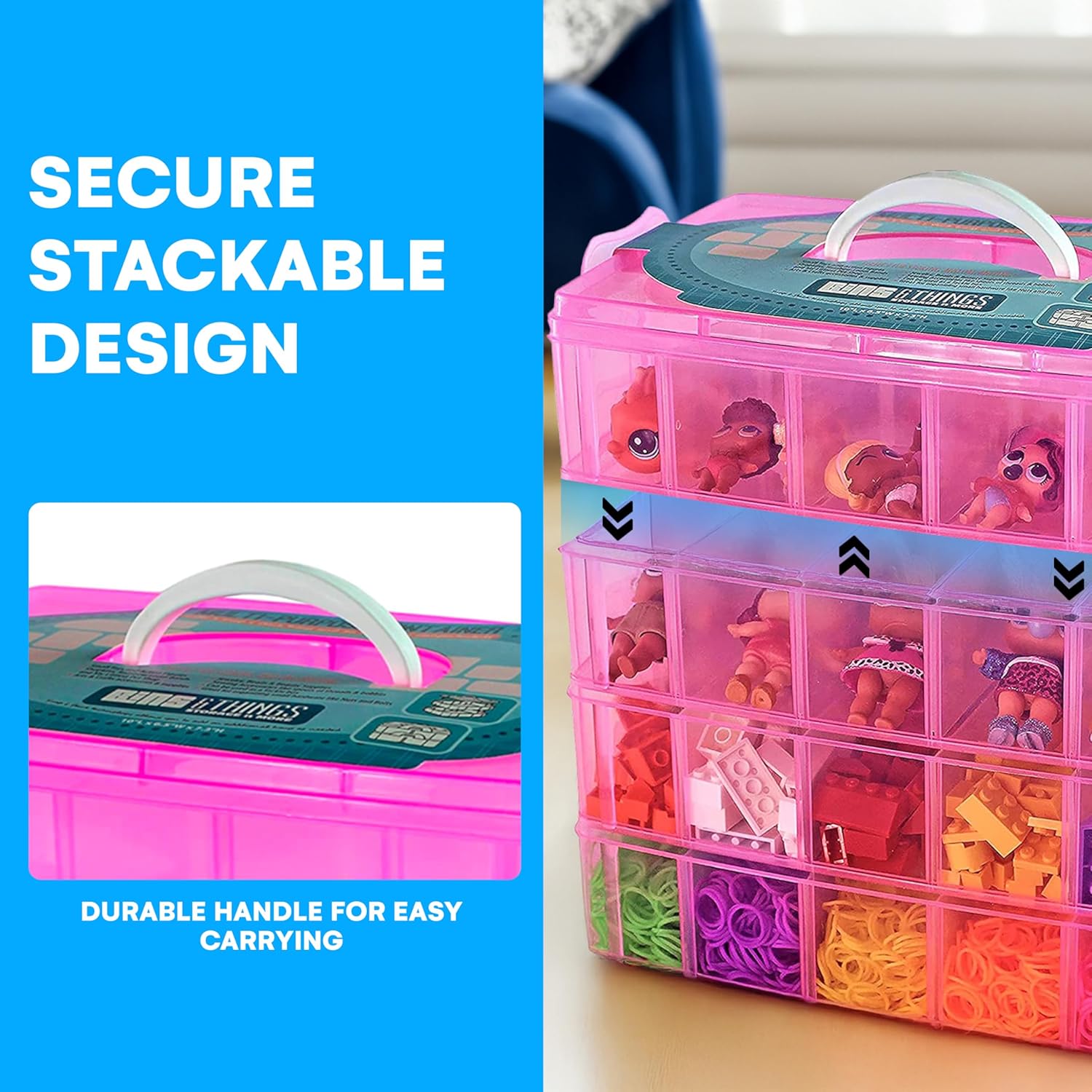 Bins & Things Bead Organizer with Adjustable Compartments - Durable Toy Organizers and Storage Solution for Dolls, Crafts, Mini Toy Figures, Jewelry and Beads - 4 Tier, 40 Compartments, Pink