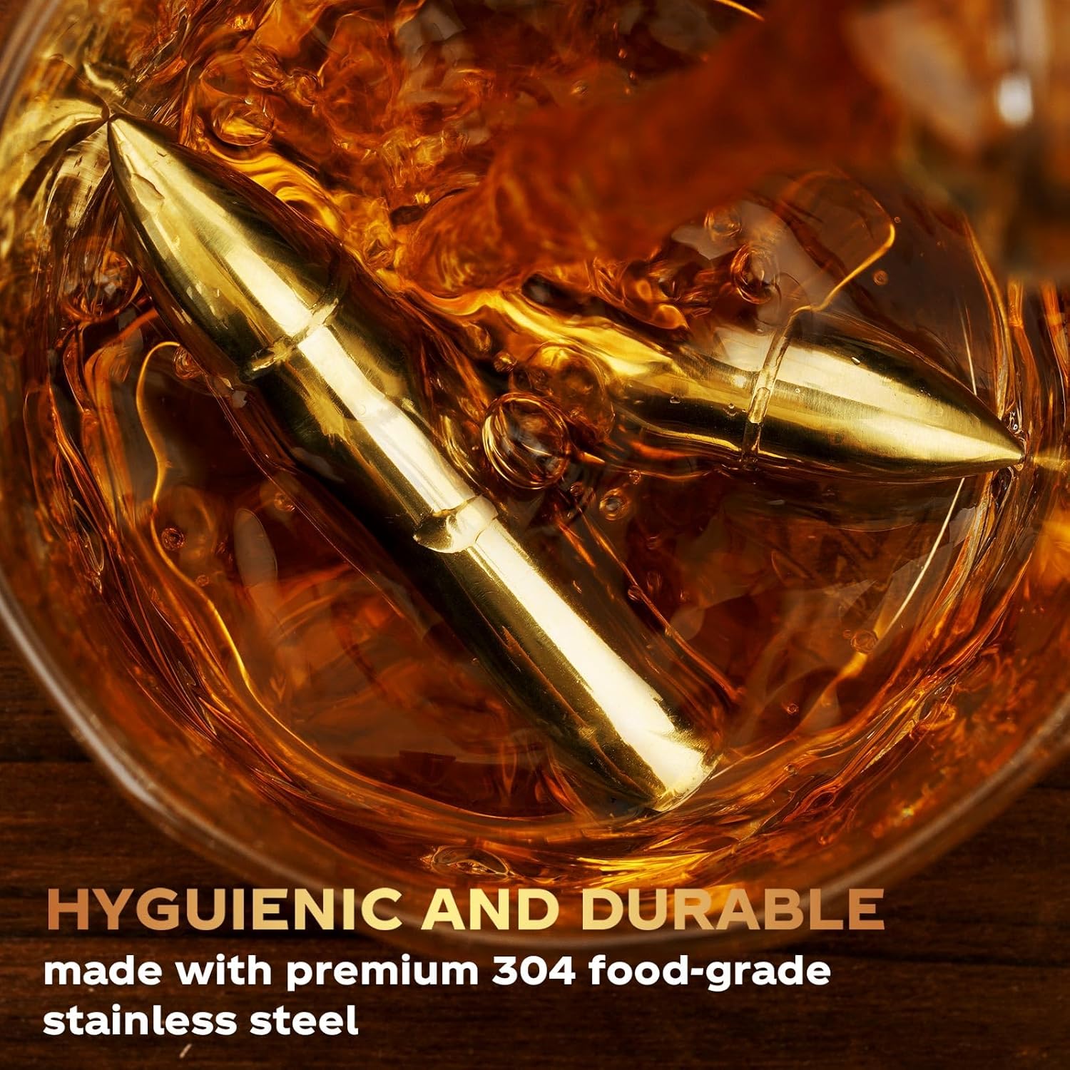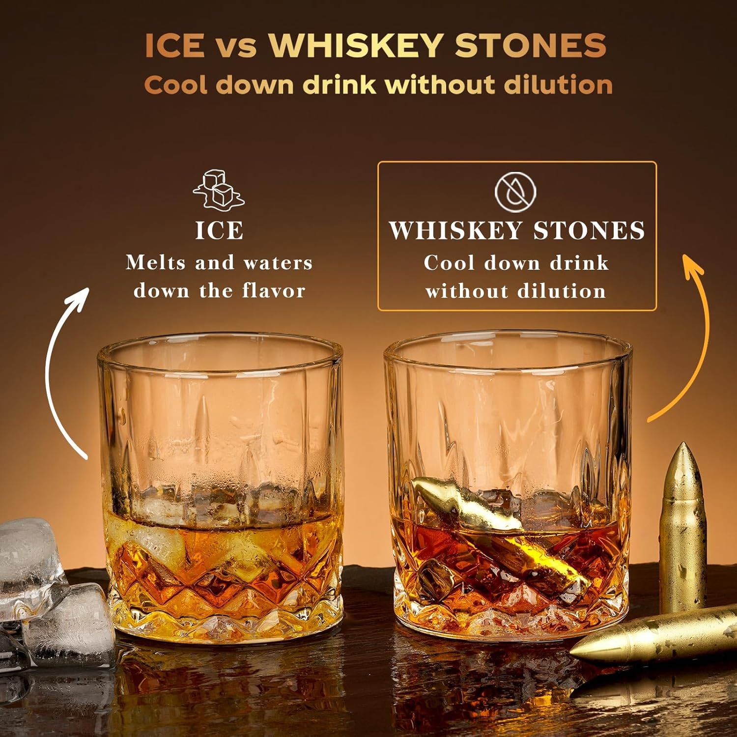 - CHILL WHISKEY WITHOUT WATERING IT DOWN: FORGET ICE. Imagine enjoying Super Cool, Undiluted Whisky at the optimum temperature from the first sip to the last. Take your whiskey enjoyment to next level. Bullet shaped Whiskey Stones are safe, tasteless, odorless to enjoy a better taste.