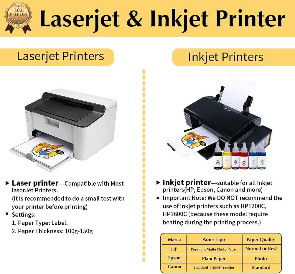 - 💕REQUIREMENTS: Laser Printers (HP,OKI,Brothers) & All Inkjet Printers | Dye Ink and Pigment Ink | Scissors or Cutting Machine | Iron or Easy Press or Heat Press machine | Teflon Paper (in the pack).