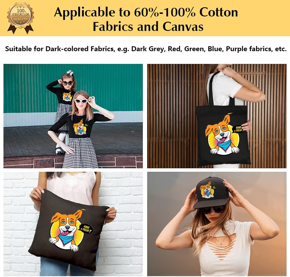 - 💕APPLICATIONS: The Upgraded Dark 3.0 printable iron on vinyl can transfer your design, text, images, photos and pictures to dark or black t shirts or fabrics. Make custom personalied DIY gifts to your friends or family on Mother's Day, Father's Day, Birthday, Thanksgiving, Easter, Halloween, Christmas, Valentine's Day or Wedding Day.