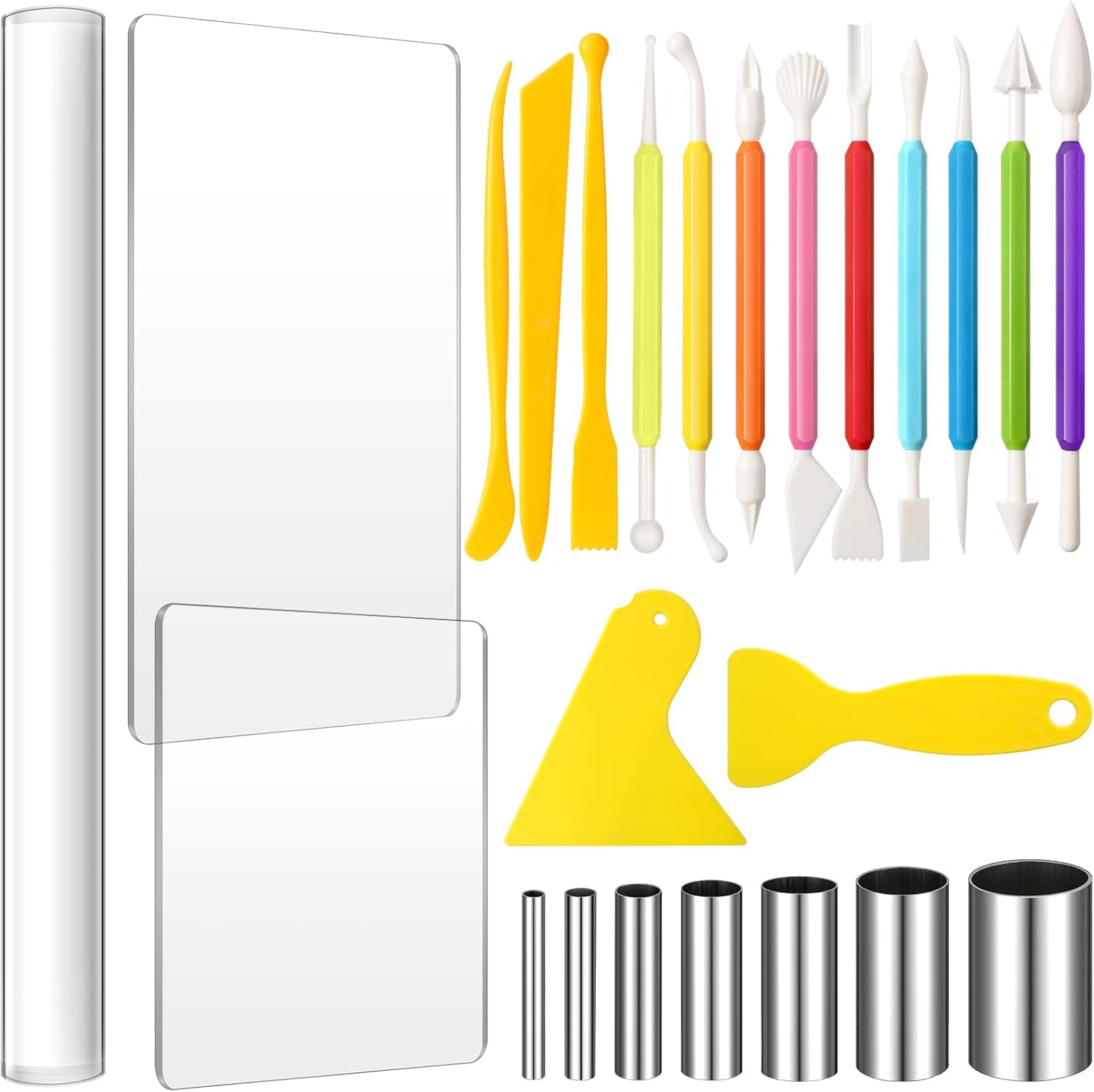 - Included Components : 1 x Acrylic clay roller, 2 x Acrylic sheets, 2 x Plastic scraper backing boards, 7 x Stainless steel round circle shape cutters, 12 x Polymer clay shaping and sculpting tools 1 x Acrylic clay roller, 2 x Acrylic sheets, 2 x Plastic scraper backing boards, 7 x Stainless steel round circle shape cutters, 12 x Polymer clay shaping an⦠See more