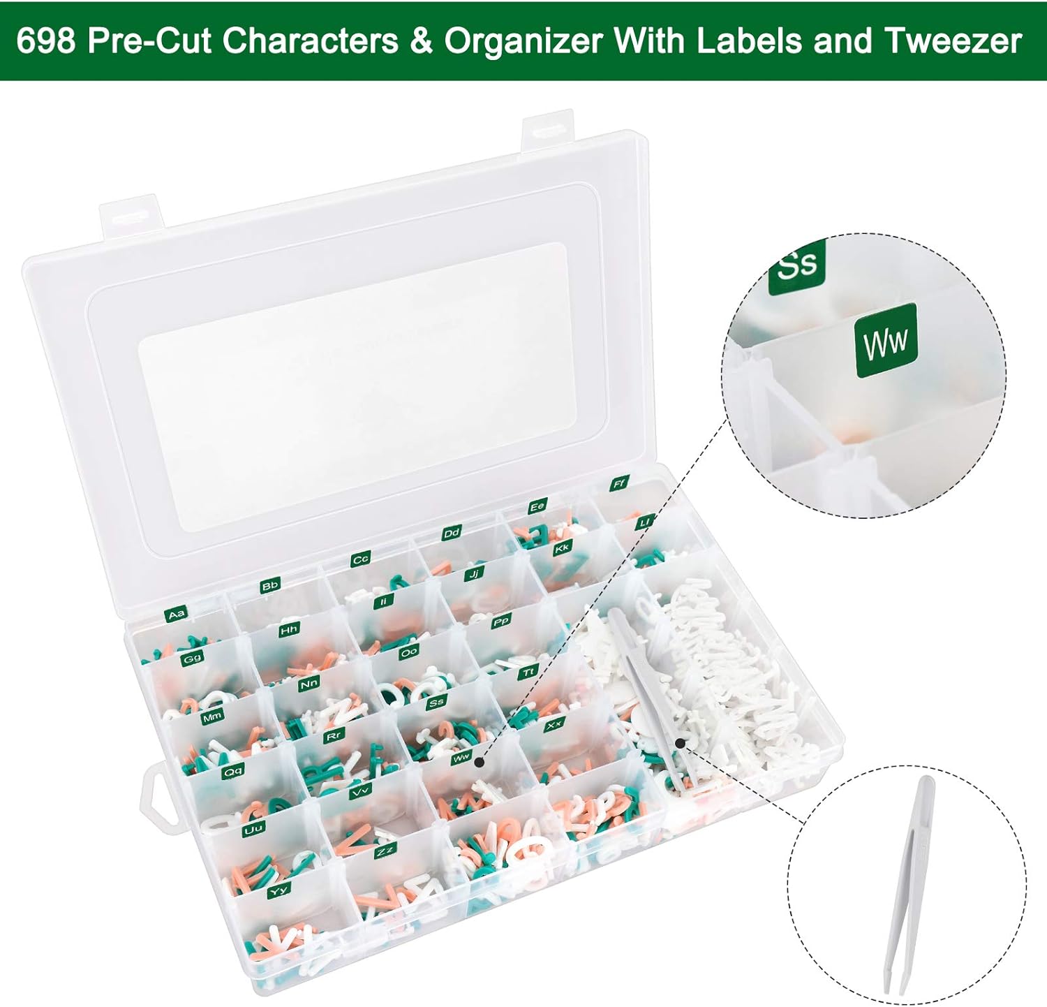 - Inside The Box---3/4 Inch: White:304 PCS + Green:152 + Pink:152 + Emojis and Symbols: 71 PCS + Cursive Days of the Week and Months: 19 PCS + Labels + Tweezer !