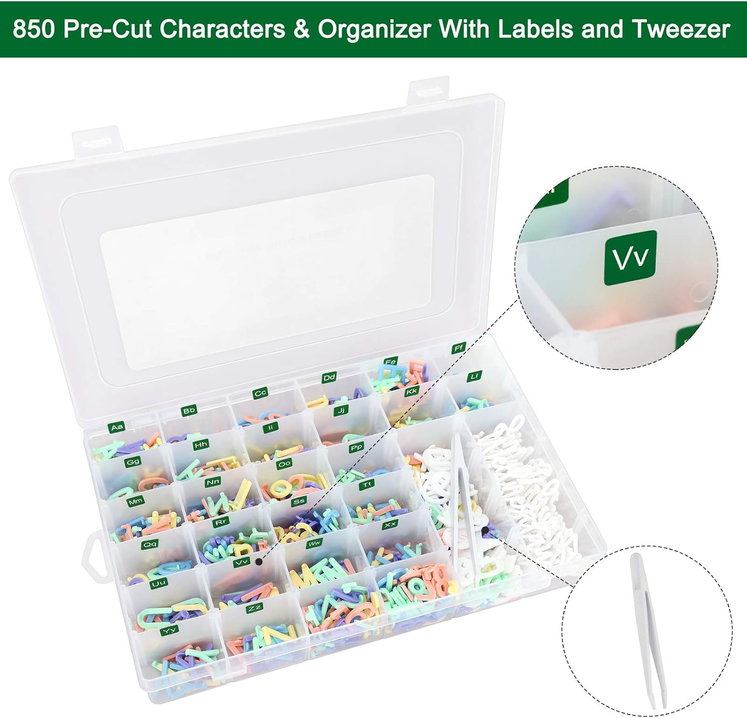 - Felt Board Letters: 850 PRE-Cut Characters,White Plastic Letters - 3/4 Inch,In 5 Colors(White,Green & Pink),Letters are have one or two pegs at bottom!