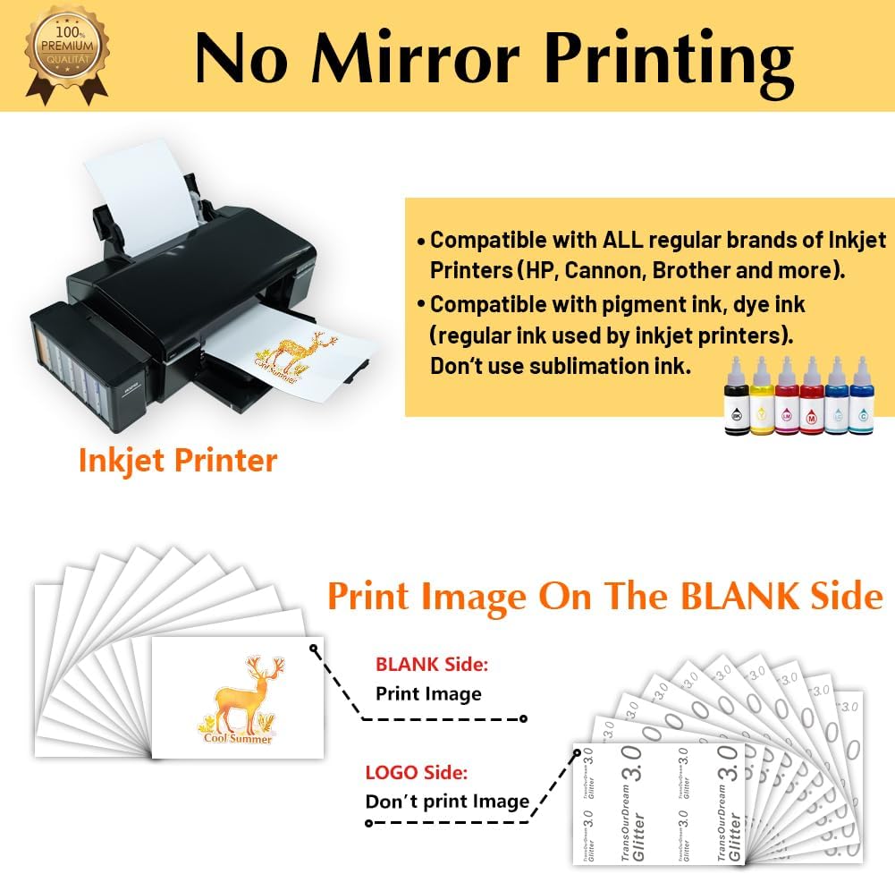 - 💕REQUIREMENTS: Inkjet Printers (such as HP, Brother and more) | Pigment Ink or Dye Ink(Do not use Sublimation Ink.) | Scissors or Cutting Machine | Iron or Heat Press machine | Teflon Paper (included in the pack).