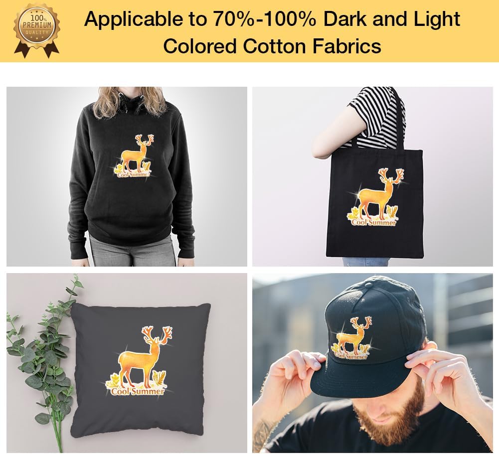 - 💕APPLICATIONS: Transfer text, images, photos and pictures onto both Light and Dark color cotton fabrics, such as sweatshirts, hoodies, totes, canvas bags, aprons, masks, pillow cases, cushion covers, tablecloths, and flags. 100% cotton fabrics are recommended. For poly blend cotton or other fabrics, please do a test first.Make custom DIY gifts to your friends or your family on Mother's Day, Father's Day, Birthday, Thanksgiving, Easter, Halloween, Christmas, Valentine's Day or Wedding Day.