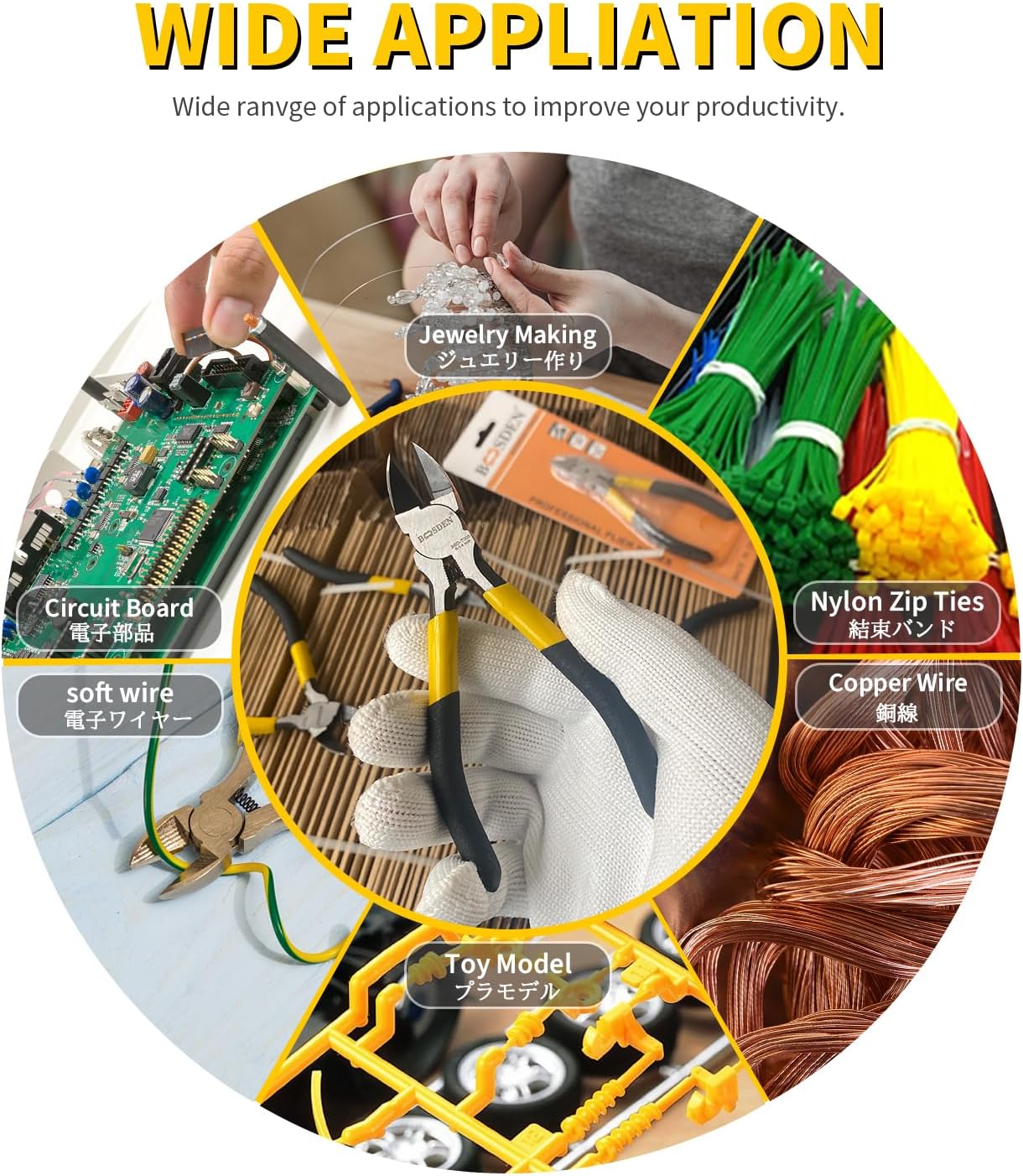 - 【Versatility】The flush cutters set, Wire Snips are suitable for cutting soft copper wire, plastic wire, small cable, aluminum wire, soft alloy wire, and this small wire cutters is ideal for jewelry making crafting, Soft materials, Electronics, Plastic, Edge banding, Flower arrangement art miniature bonsai pruning etc.