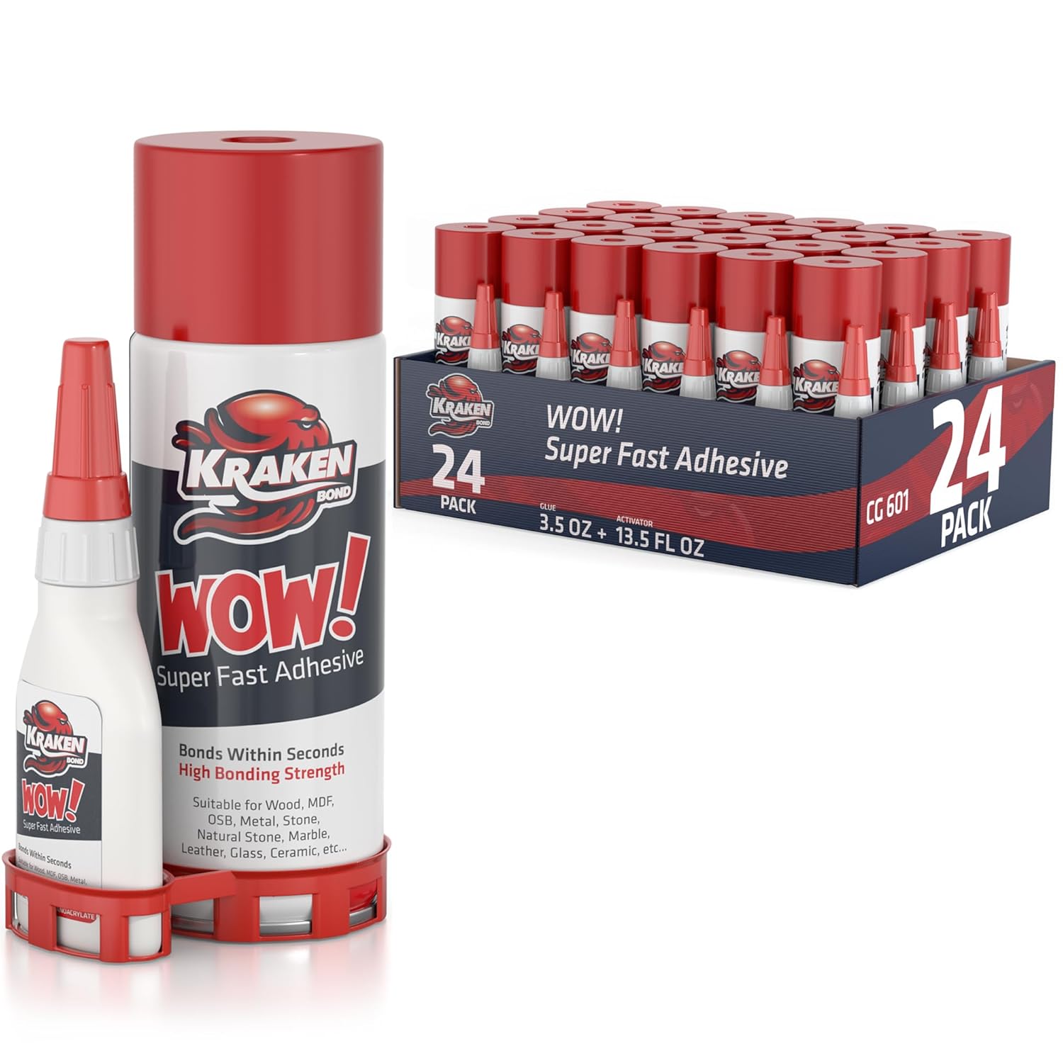 Kraken Bond Wow! CA Glue (24x3.50 oz) with Spray Adhesive Activator (24x13.50 fl oz) - Cyanoacrylate, with Activator, Fast CA Glue for Woodworking, Crazy & Craft - 24 Pack
