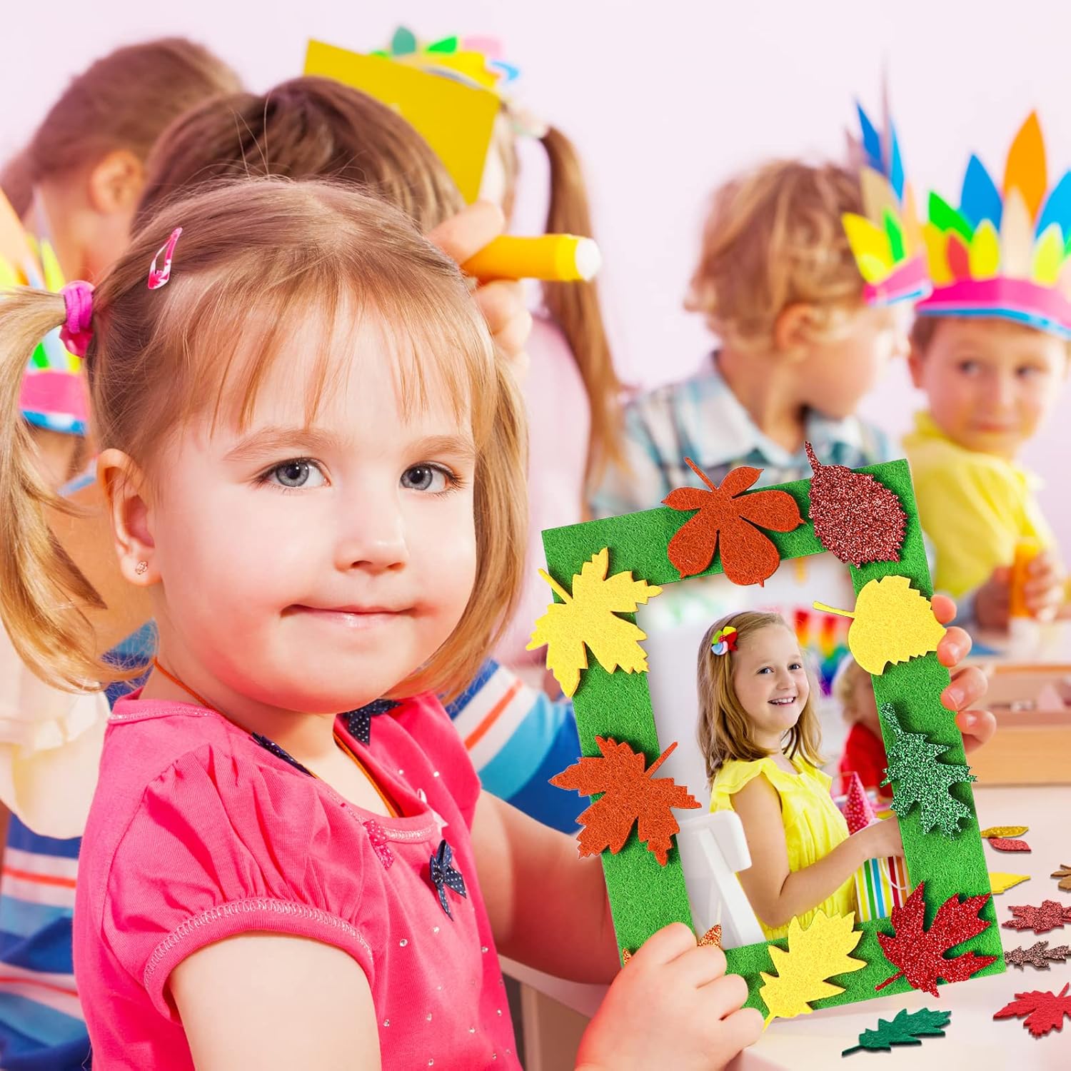 Ferraycle 232 Pcs Fall DIY Picture Frames Craft Kit Thanksgiving Felt Photo Frames with Leaves Pumpkin Harvest Crafts with Foam Stickers for Autumn Party Favor(Mix Color,Leaf)