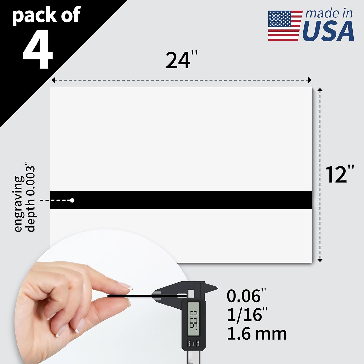 - Technical Data: Size: 12"x24.25" | Thickness: 0.06” (1/16", 1.6 mm) | Engraving depth: 0.003" (0.8 mm) | Top Color: White (RAL 9002) | Core Color: Black (RAL 7021) | Transmittance: Opaque
