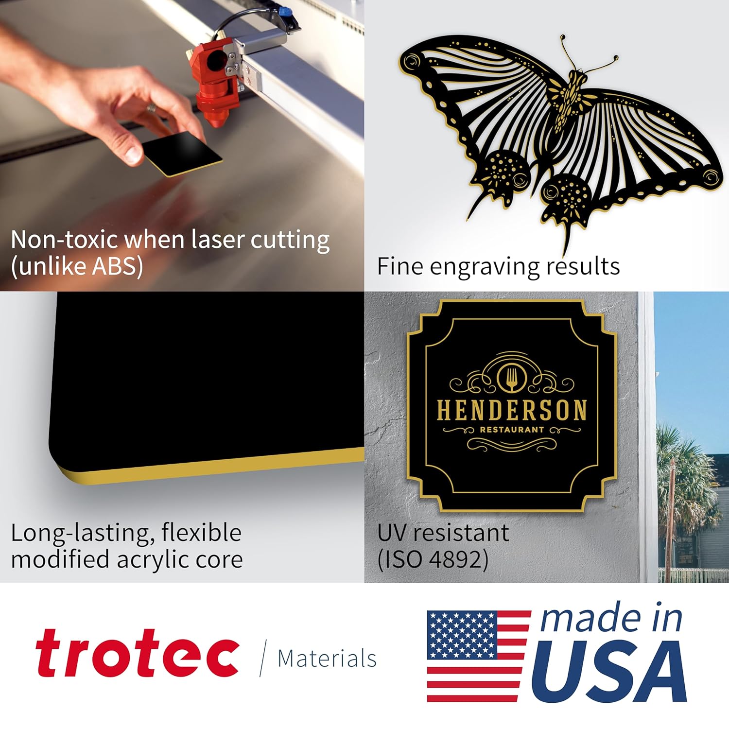 Trotec TroLase | 12"x12"x1/16", 8 Pcs | Black/Gold | 2 Ply | Modified Acrylic | Laser Engraving Double Color Plastic Sheet | Engraving Blanks for Laser, Saw, Guillotine | Made in USA