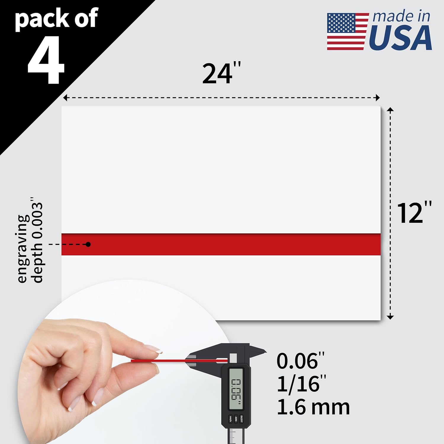 - Technical Data: Size: 12"x24.25" | Thickness: 0.06” (1/16", 1.6 mm) | Engraving depth: 0.003" (0.8 mm) | Top Color: WhiteRAL 9003) | Core Color: Red (RAL 3000) | Transmittance: Opaque