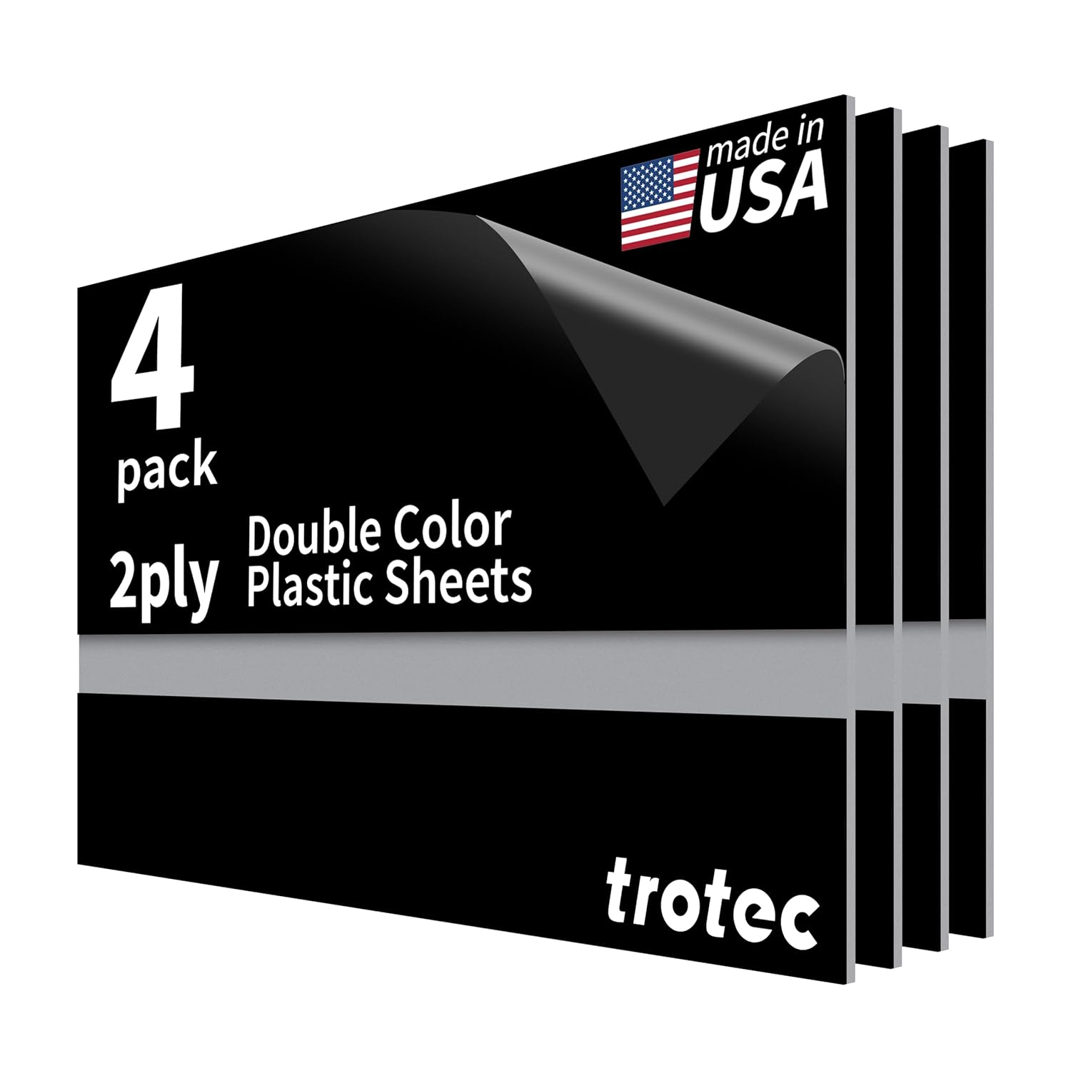Trotec TroLase | 12"x20"x1/16", 4 Pcs | Black/Silver | 2 Ply | Modified Acrylic | Laser Engraving Double Color Plastic Sheet | Engraving Blanks for Laser, Saw, Guillotine | Made in USA