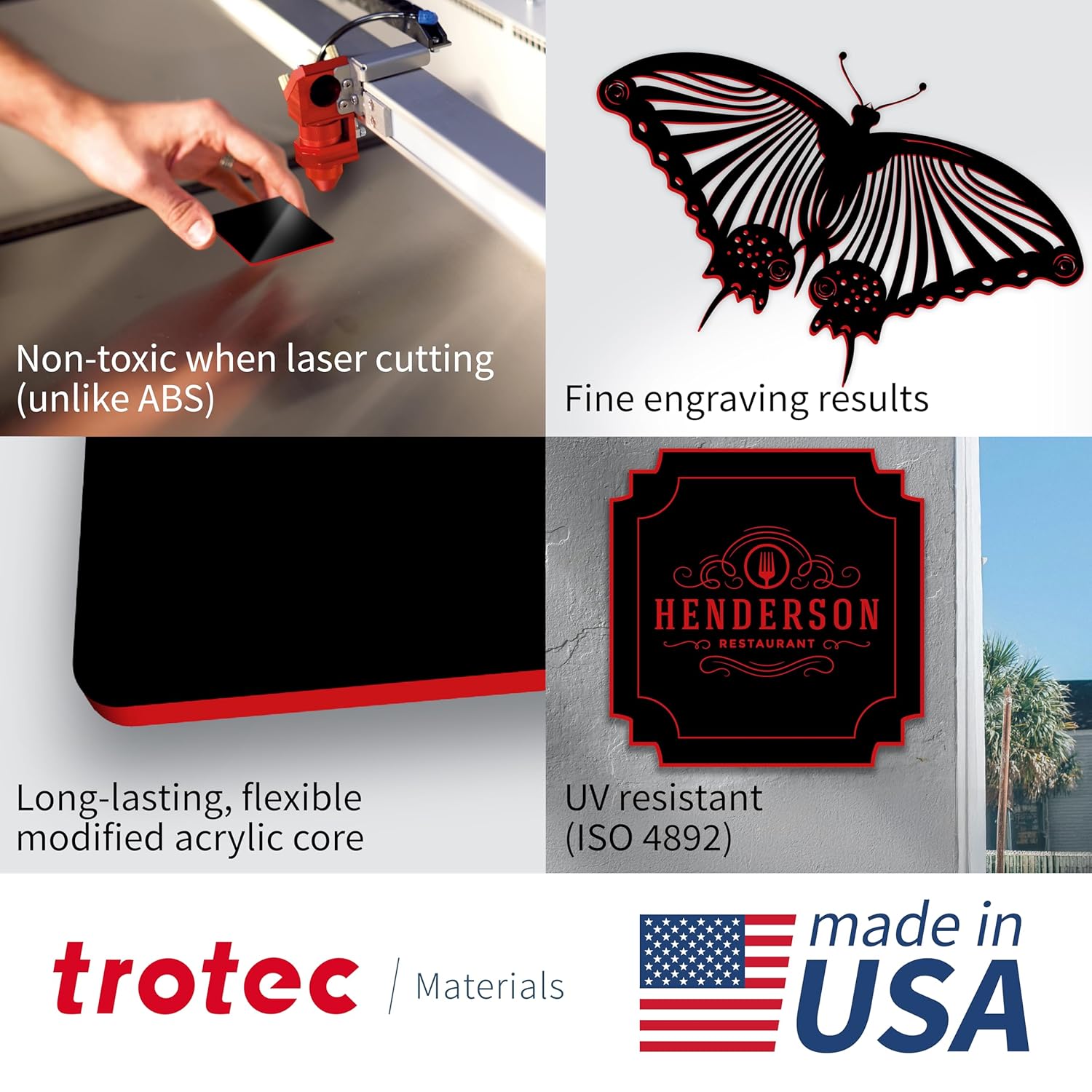 Trotec TroLase | 12"x24"x1/16", 4 Pcs | Black/Red | 2 Ply | Modified Acrylic | Laser Engraving Double Color Plastic Sheet | Engraving Blanks for Laser, Saw, Guillotine | Made in USA