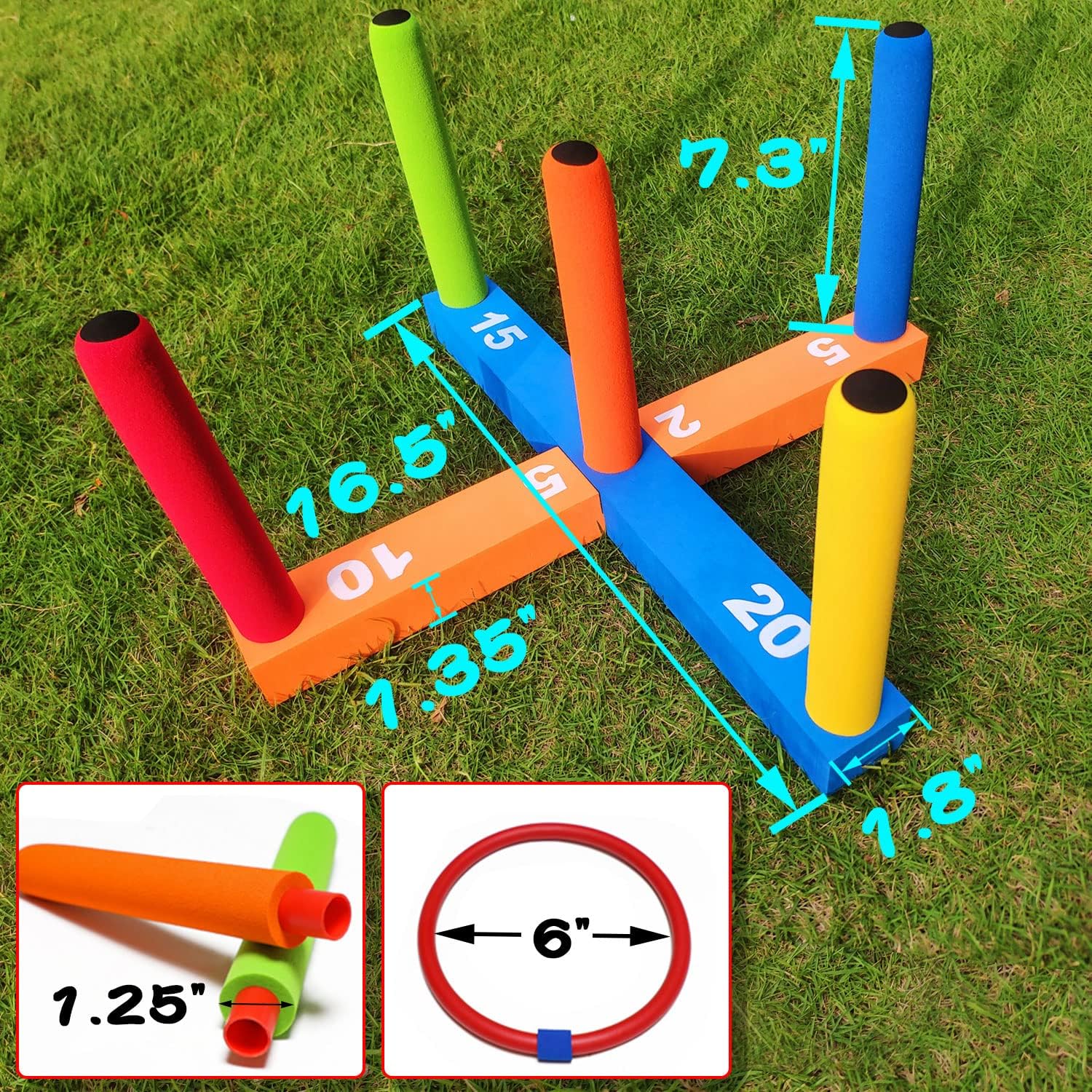 - ☀Classic Ring Toss Game Multi Players Design : YDDS ring toss game including 5 poles, 4 orange soft foam rings, 4 yellow soft foam rings, 4 blue soft foam rings, 4 red soft foam rings, and 2 soft EVA foam bases with score markings for easy outdoor toss game competition play.