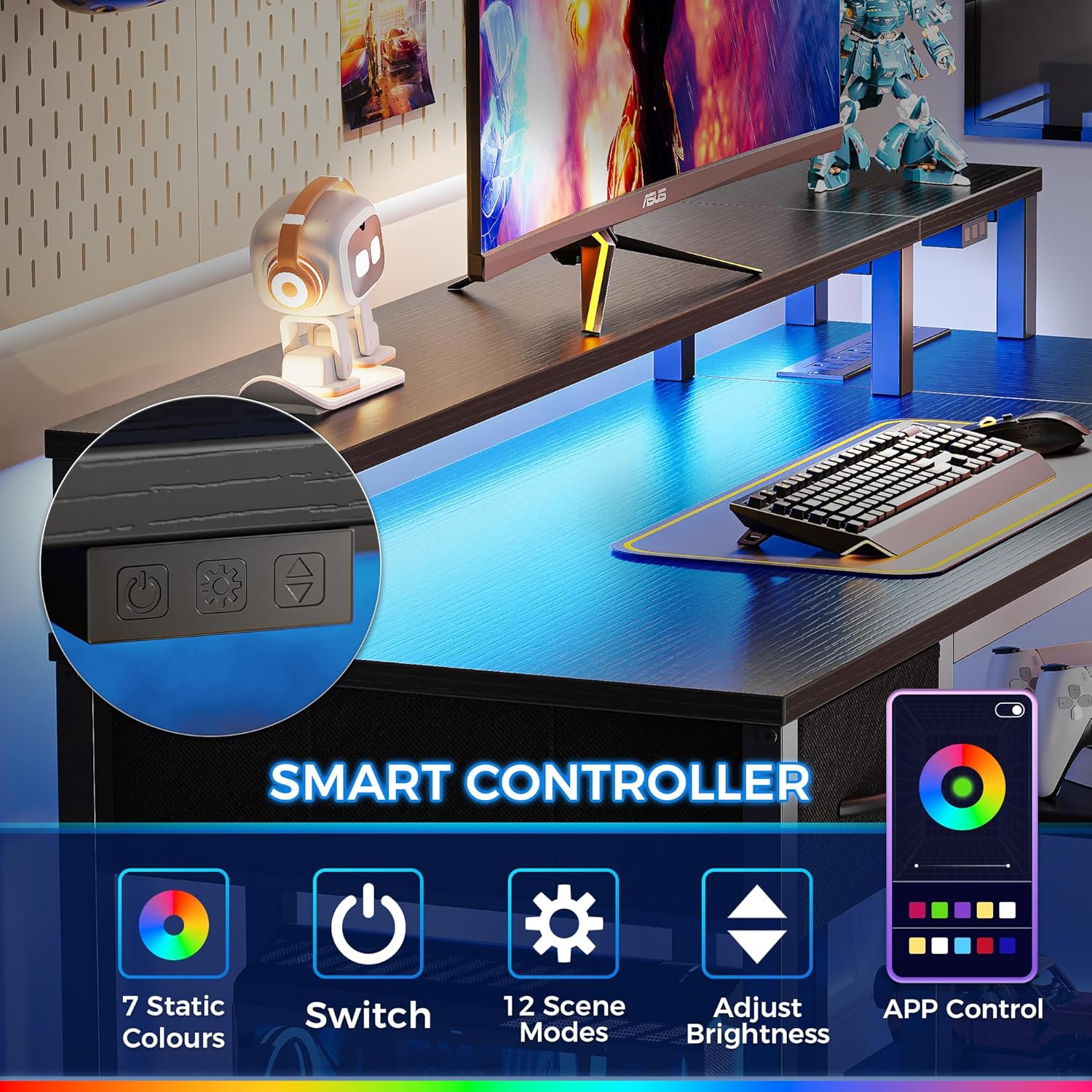 - 【Desk with LED Lights】Create the perfect ambiance for gaming or working with this computer desk. Choose from over 60,000 colors and enjoy the timing mode, mic mode, and music mode via the App. Alternatively, use the smart controller to switch between 12 scene modes, adjust speed levels, and set 3 brightness levels. Plus: The LED light strip needs to be plugged into a USB port to work