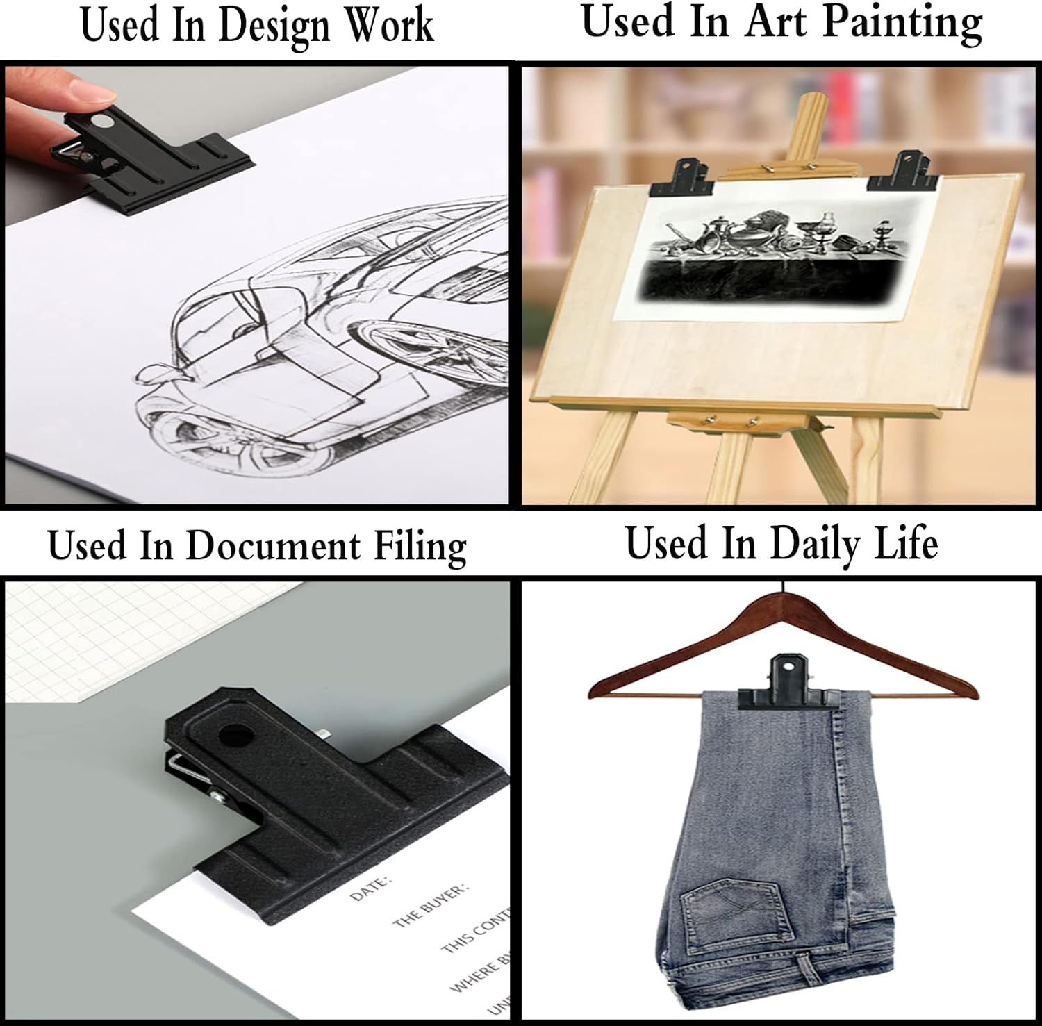 - 【Multiuse 4.3 Inch Metal Clips】These binder clips extra large can be used as bag clips for food, clipboard clips, clips for paperwork, bulletin board clips, metal clips for crafts, office clips large, clips for hanging pictures, drawing board clips, wall hanging clips and much more.