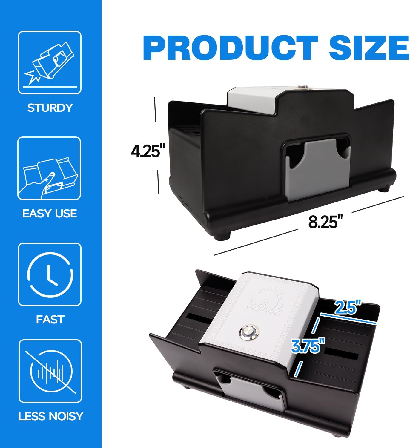 - Easy To Use: Just insert the cards into the two slots, and press the switch at the top of the card shuffler, with the machine shuffling quickly and efficiently; shuffles two decks of playing cards in seconds, save your time; the shuffler dimensions are 8.25" L x 3.75" W x 4.25" H