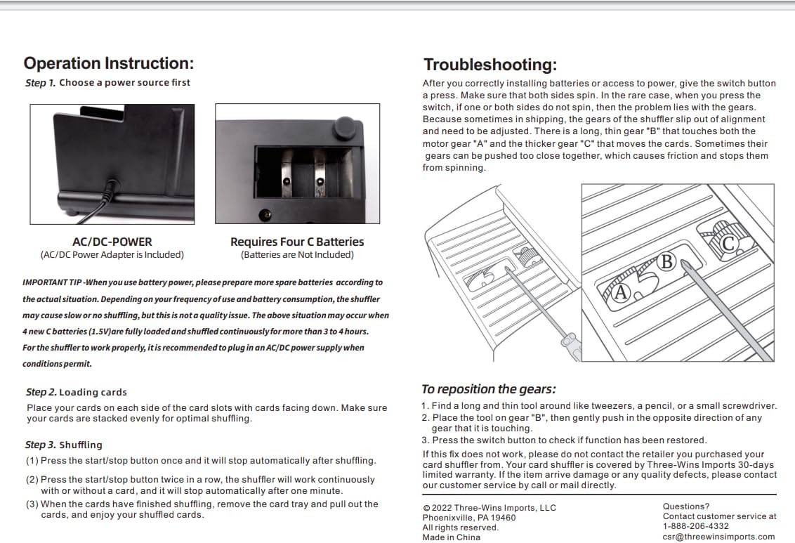 - Important Tip: The card shuffler requires four C batteries if you use batteries to operate ( batteries not included); flat cards and new cards work great, bend cards or old cards may not work (playing cards are not included)