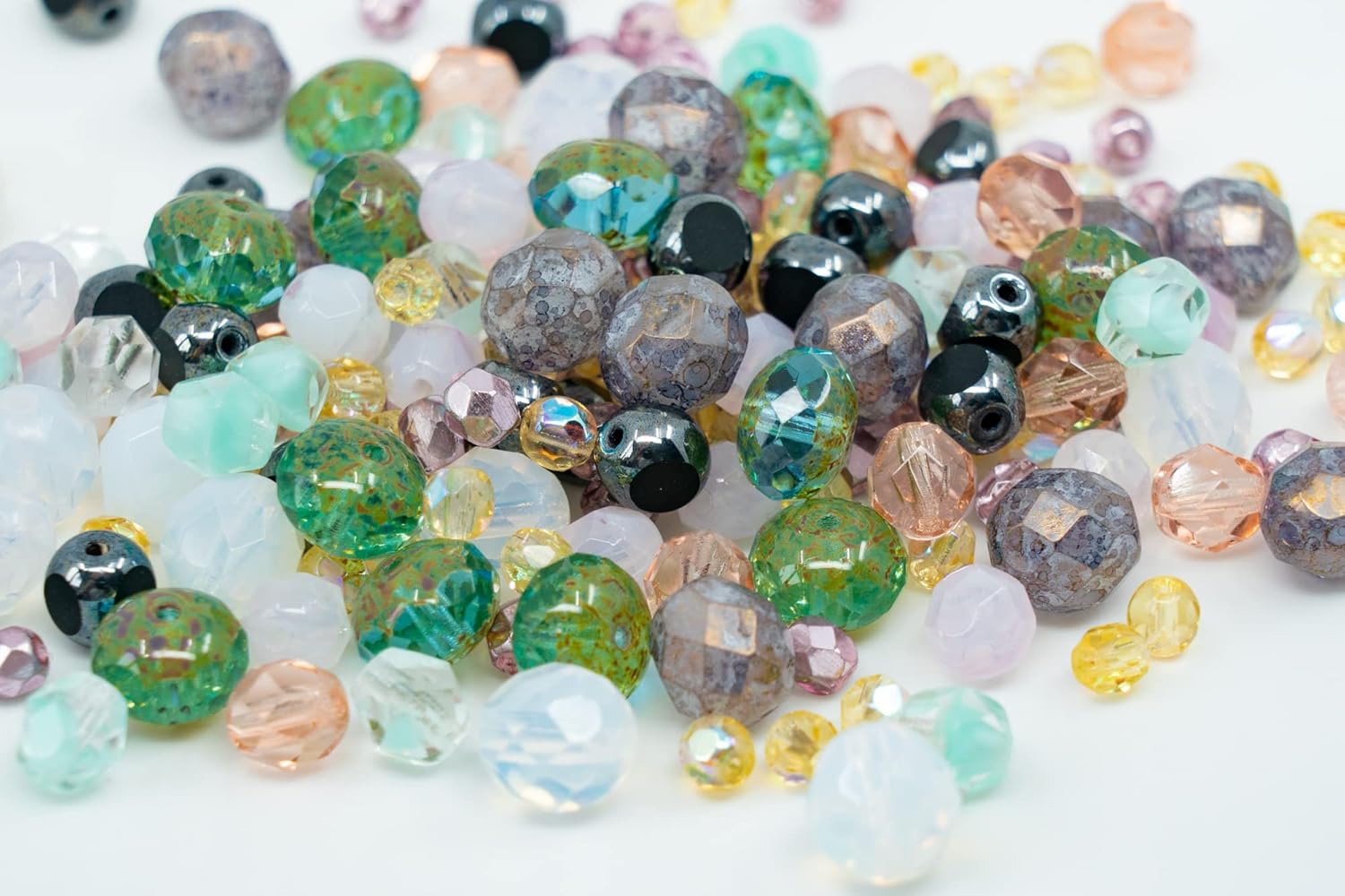 - ⭕️ COLOR ► Mix of gentle transparent, semi-transparent opal, and opaque colors. The beading kit containes pale pink, rosaline, teal, light blue, Yellow, AB, hematite, and white colors. Transapent, opaque and coated beads are included. ⭕️ BEADS ► round, rondelle, cathedral shape polished beads