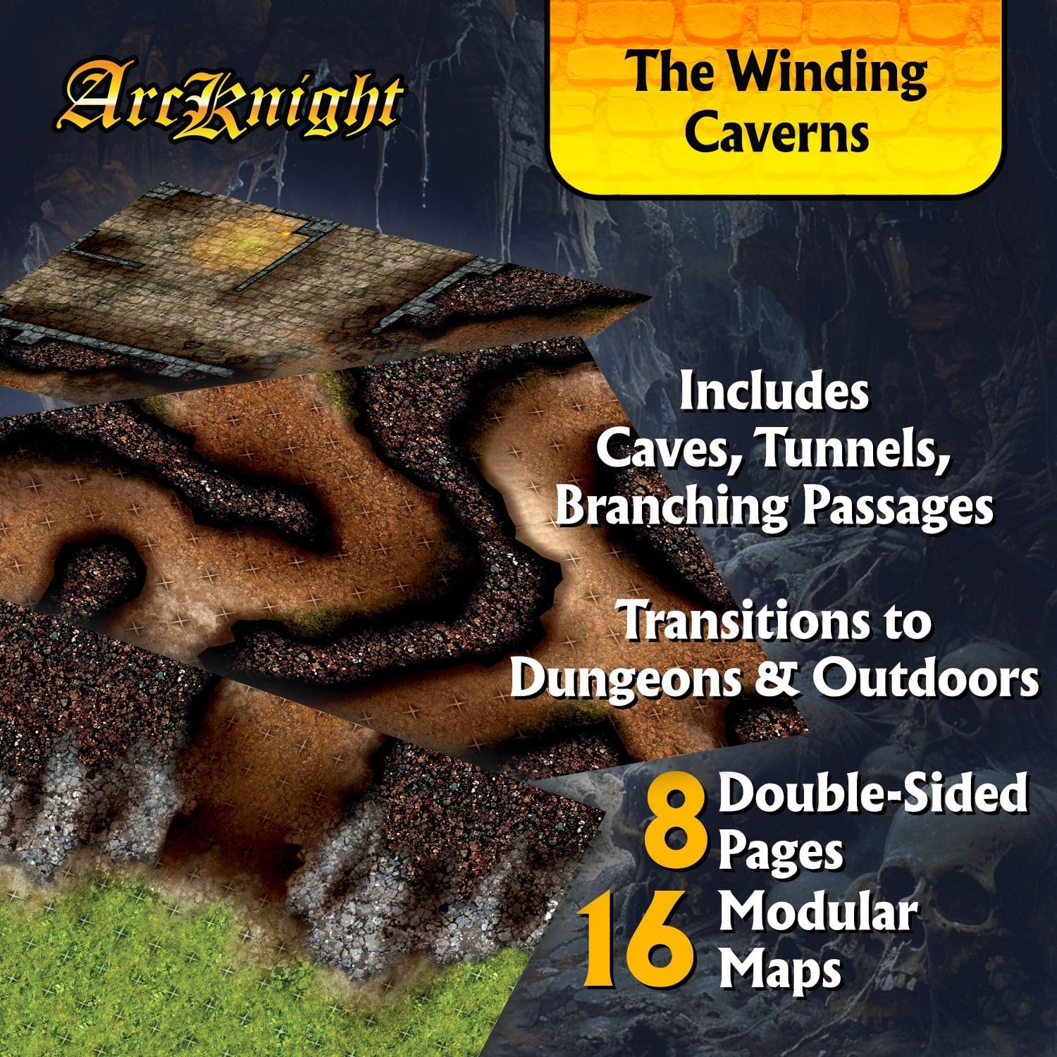 Arcknight The Winding Caverns Roleplaying Battlemaps; 16 Modular RPG Maps in 8 Double-Sided Pages, 1" Square Grid, Modular & Versatile Design for Tabletop Gaming - for Dungeons & Dragons & Pathfinder