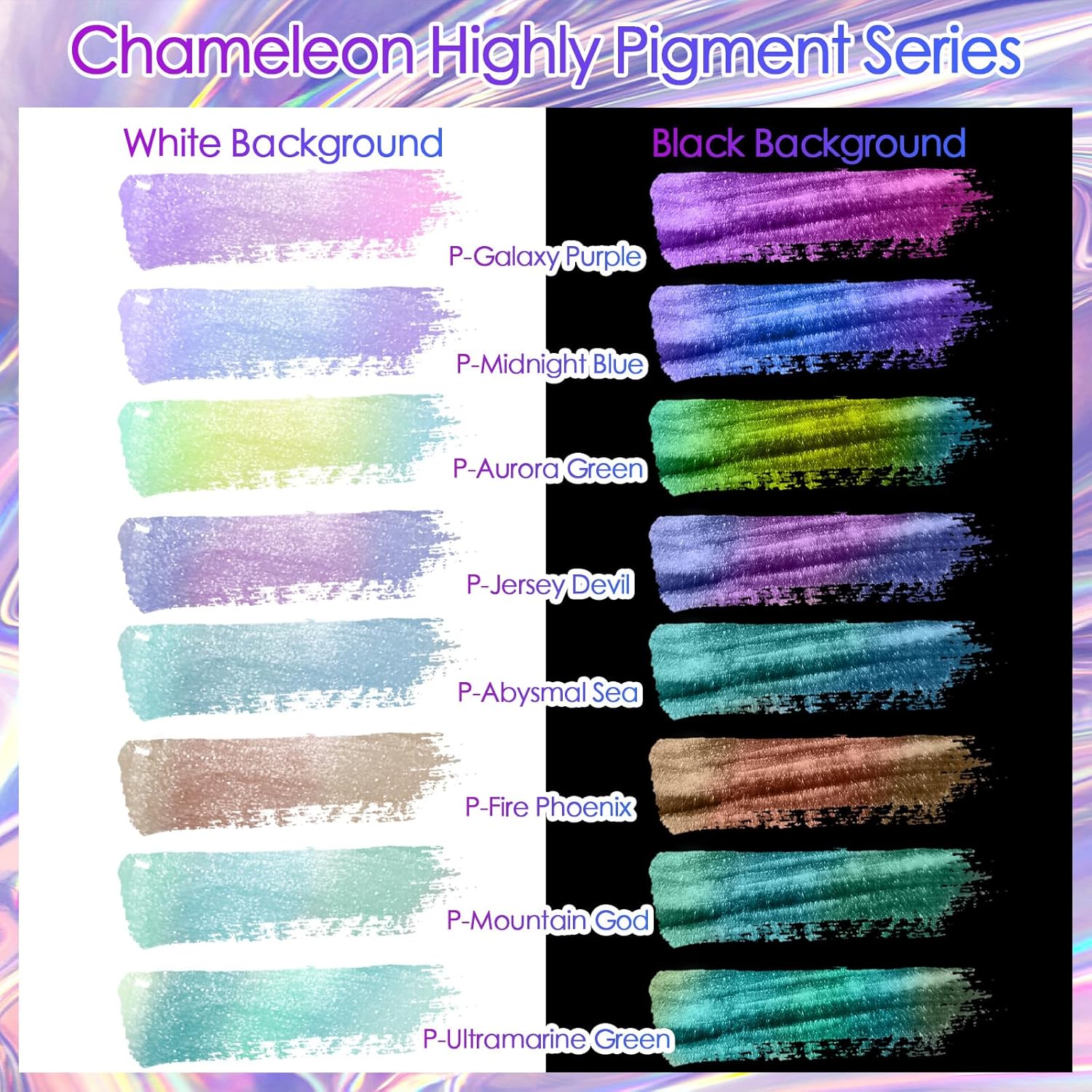 - 🫧Mica pigment's 3 Different Effects: Different color bases create a different effect surface. Applying pearl powder on a white background will produce aurora effect, and on a black background will be chrome effect. Mixing a small amount of pearl chrome powder into the black resin will produce like starry sky effect. So easy to use to get the variety of colors you’re looking for!