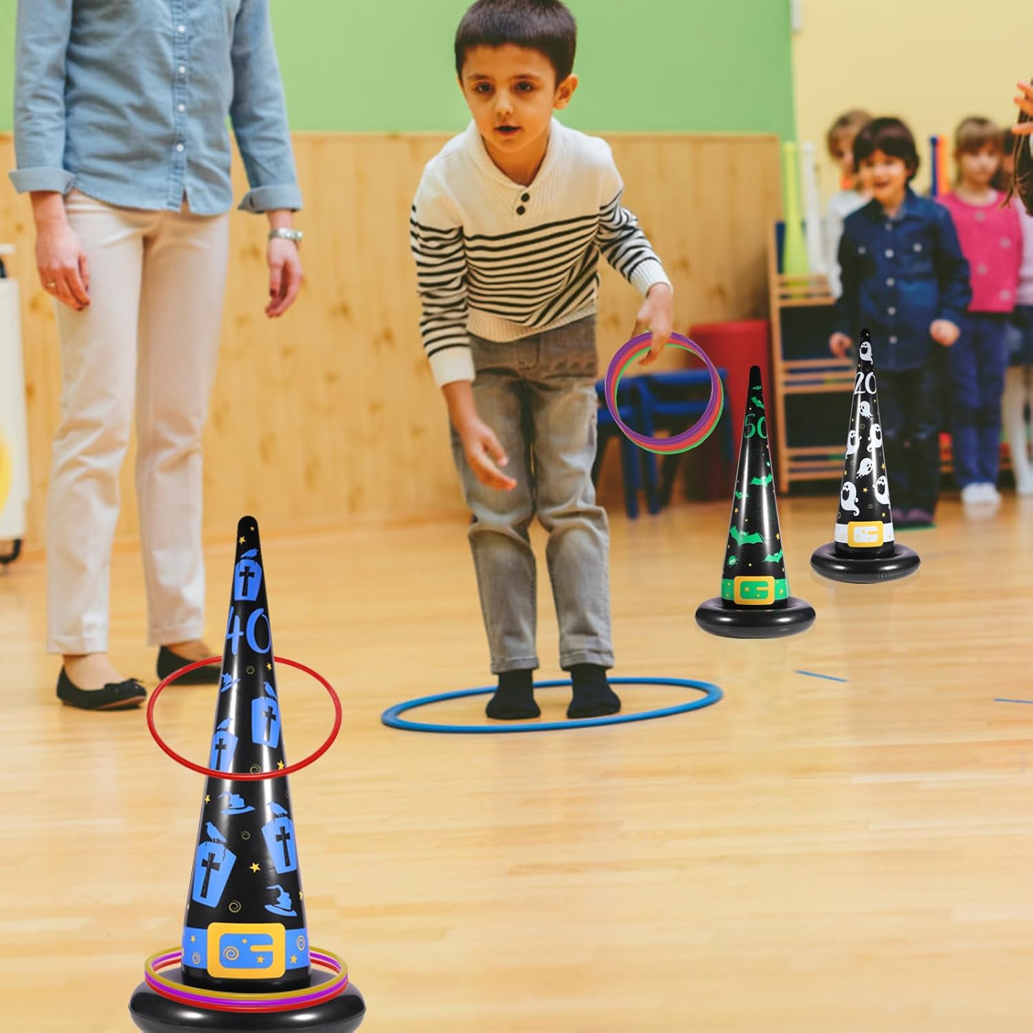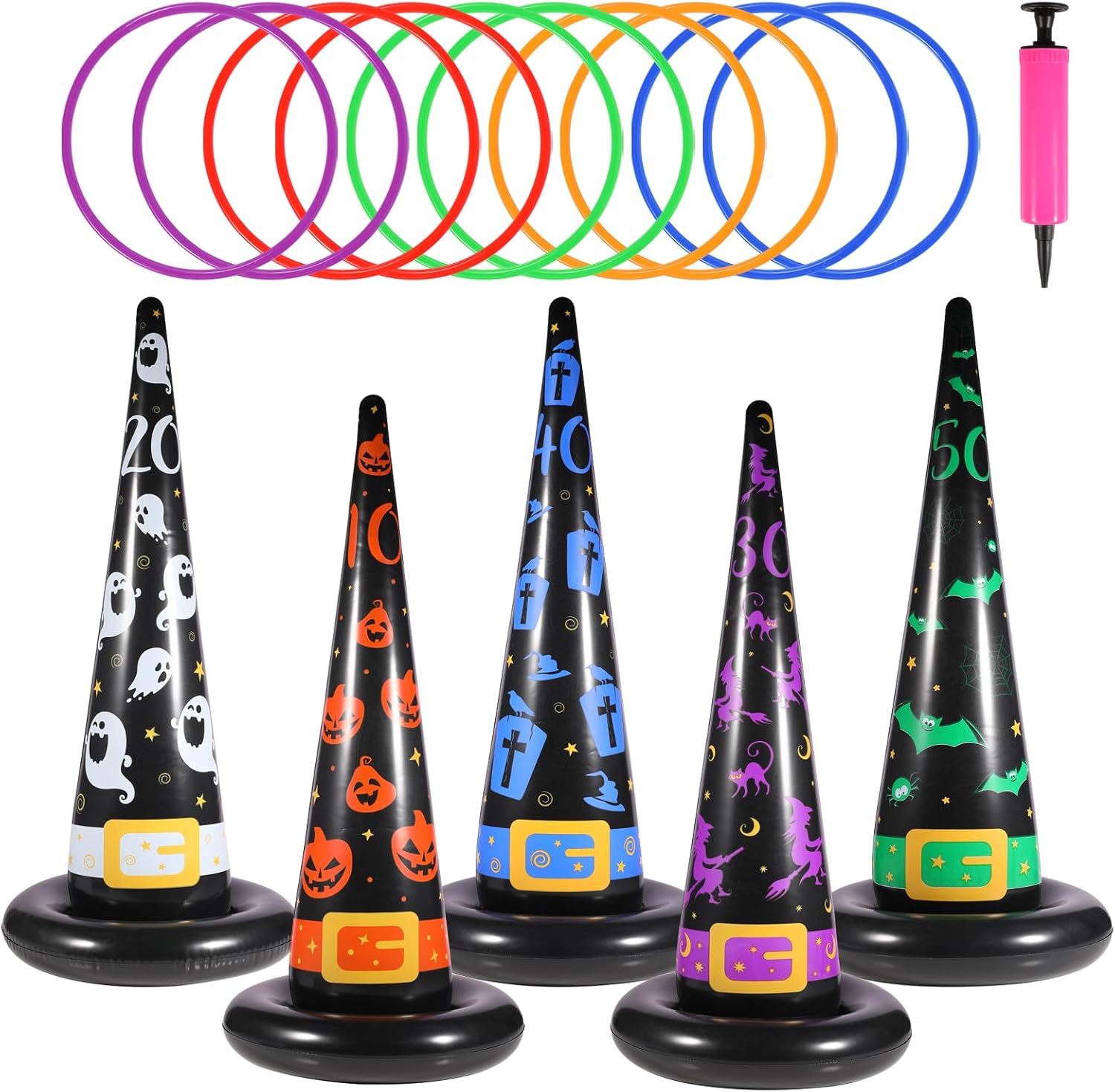 - ๐๐๐ ๐ข๐๐๐ฅ ๐๐๐ฅ๐ฅ๐จ๐ฐ๐๐๐ง ๐ ๐ฎ๐ง - Transform your party with the Inflatable Witch Hat Ring Toss Game! Embrace the spooky season with witches, ghosts, pumpkins, bats, and tombstones in a thrilling challenge.
