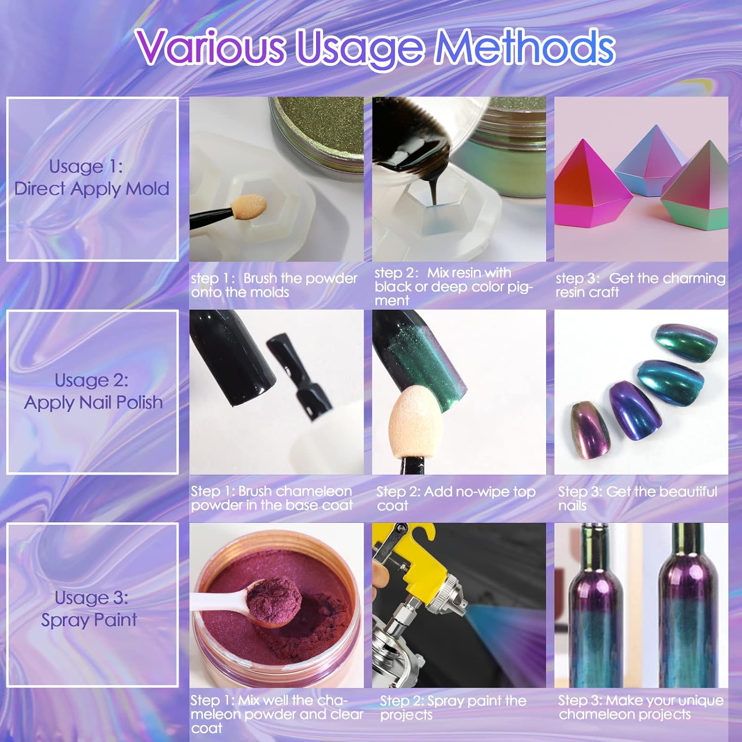 - 🫧Mica pigment's 3 Different Effects: Different color bases create a different effect surface. Applying pearl powder on a white background will produce aurora effect, and on a black background will be chrome effect. Mixing a small amount of pearl chrome nail powder into the black resin will produce like starry sky effect. So easy to use to get the variety of colors you’re looking for!