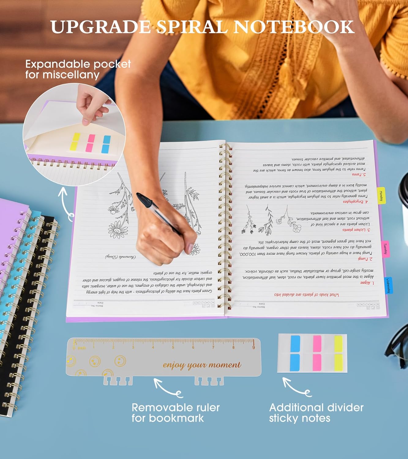 - 【Strong Spiral Metal Twin-Wire】 Our spiral journal notebook has a sturdy gold-color double wire spiral with easy-to-turn pages and keeps pages attached reliably, while still staying flat when opened, which reading more convenient and taking notes more efficient. Spiral bound journal easy to tear-off and fold over, as well as flip the cover back, giving you a better writing experience. Golden spiral bound adds aesthetic matching, it’s the perfect big notebook for journaling, and planning.