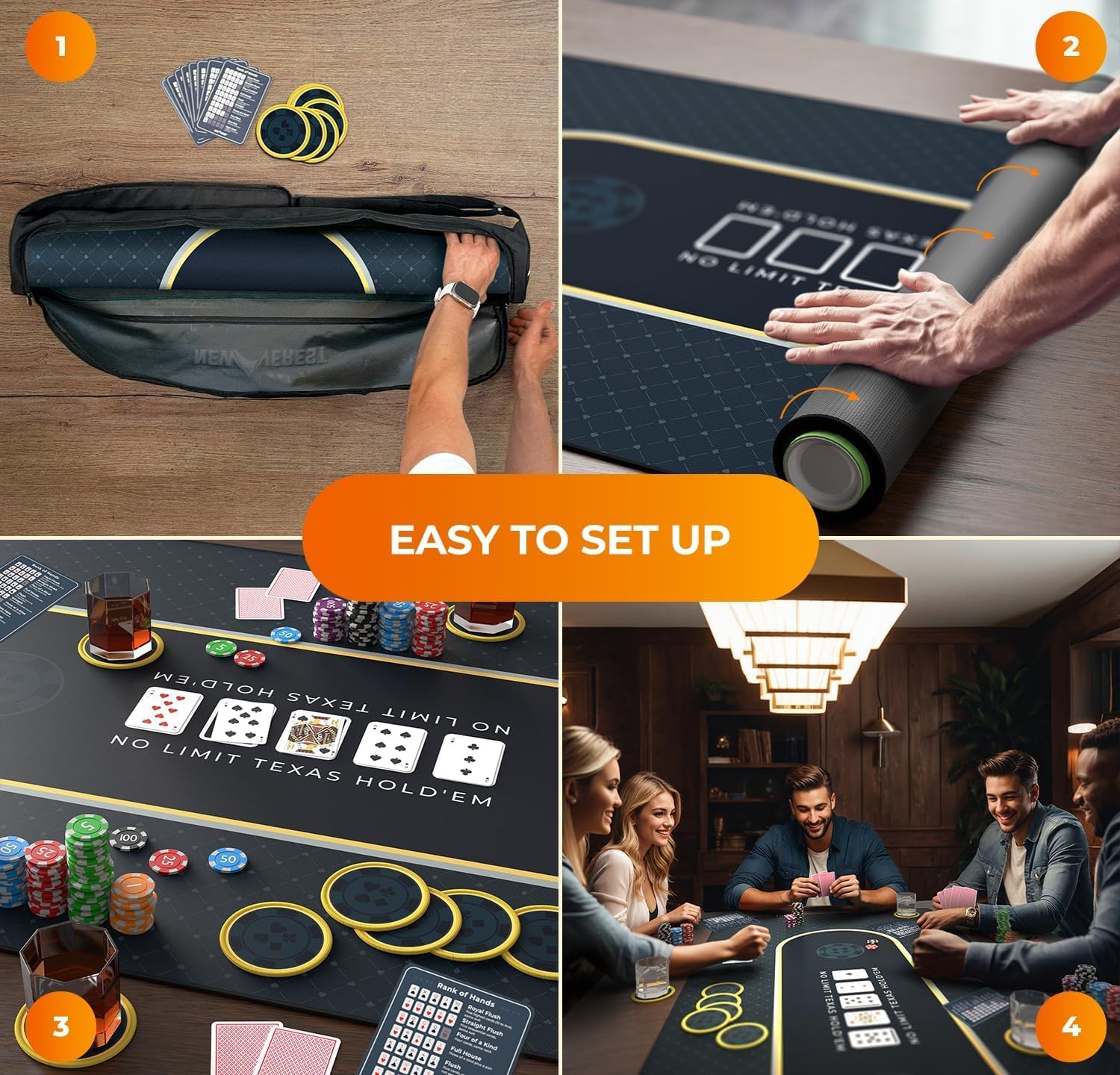 - Coasters & quick-reference cards - Say goodbye to drink stains with our 8 coasters, designed to protect your poker mat for table from dirty circles caused by glasses. Use the included 8 insert cards to display poker hands, offering quick reference for a phone-free, focused game.