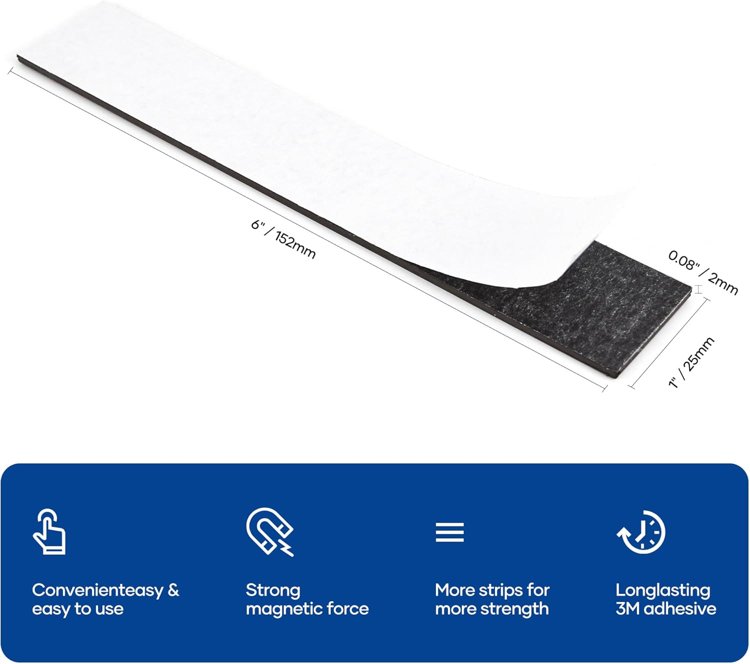 - SIZE: Each heavy duty magnetic tape measures 1 x 6 inches with a 0.08 inches(2 mm) thickness. 6 packs pre-cut magnetic strips in one package to meet your needs in any situation.
