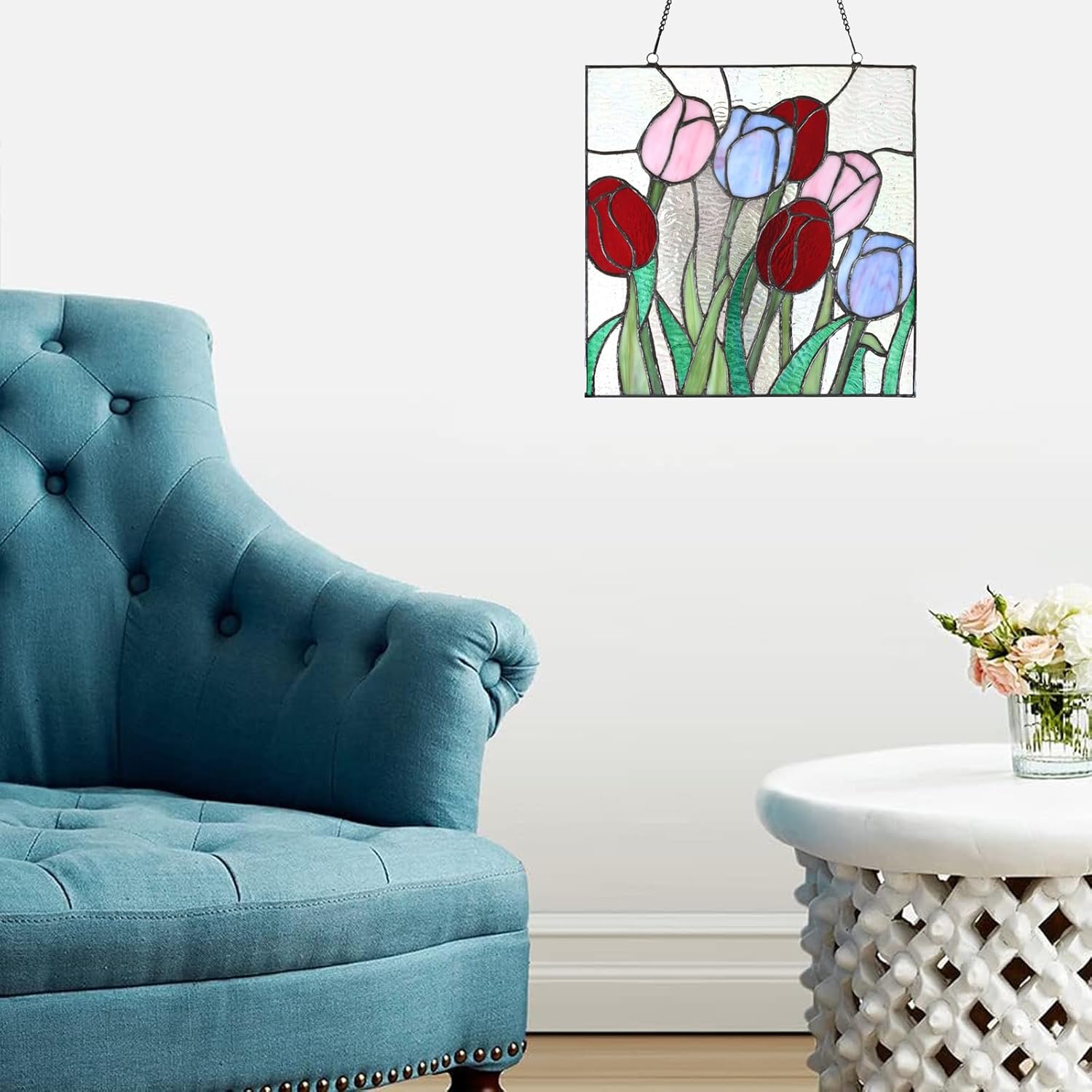 - DESIGN- This is a colourful tulips designed stained glass window panel, sized in W 12"x H 12" and a L 24" black metal chain included.When the sunlight is shinning through, the tulips come to activity and life, make you feel as if you are in a garden, make your home more warm and happy.It is a bunch of flowers that never fade.