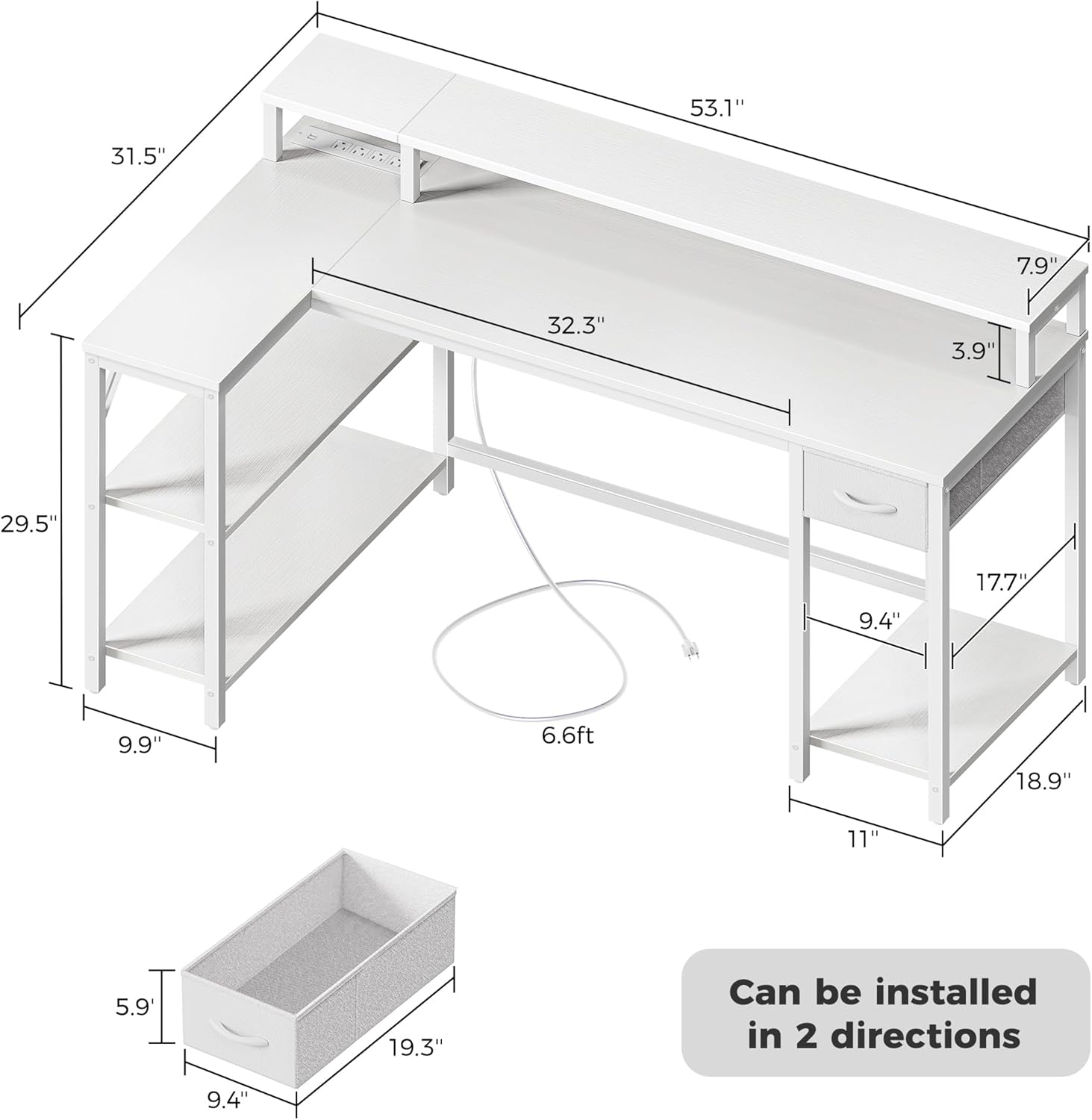 SUPERJARE 53 inch Reversible L Shaped Desk with LED Lights & Power Outlets, Computer Desk with Shelves & Monitor Stand, Gaming Desk with Drawer, Home Office Desk Corner Desk, PU White Drawer