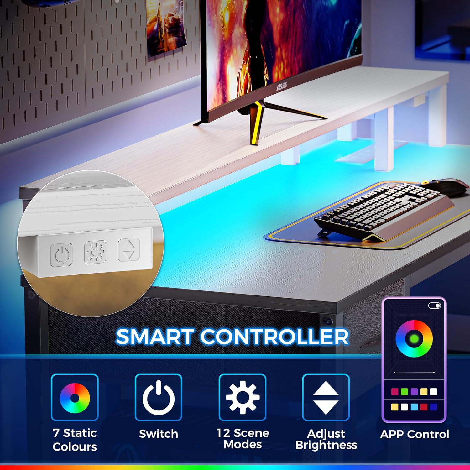 - 【L Desk With LED Lights】PATENT PENDING! Create the perfect ambiance for gaming or working with this computer desk. Choose from over 60,000 colors and enjoy the timing mode, mic mode, and music mode via the App. Alternatively, use the smart controller to switch between 12 scene modes, adjust speed levels, and set 3 brightness levels. Plus: Contain patent pending drawer slide