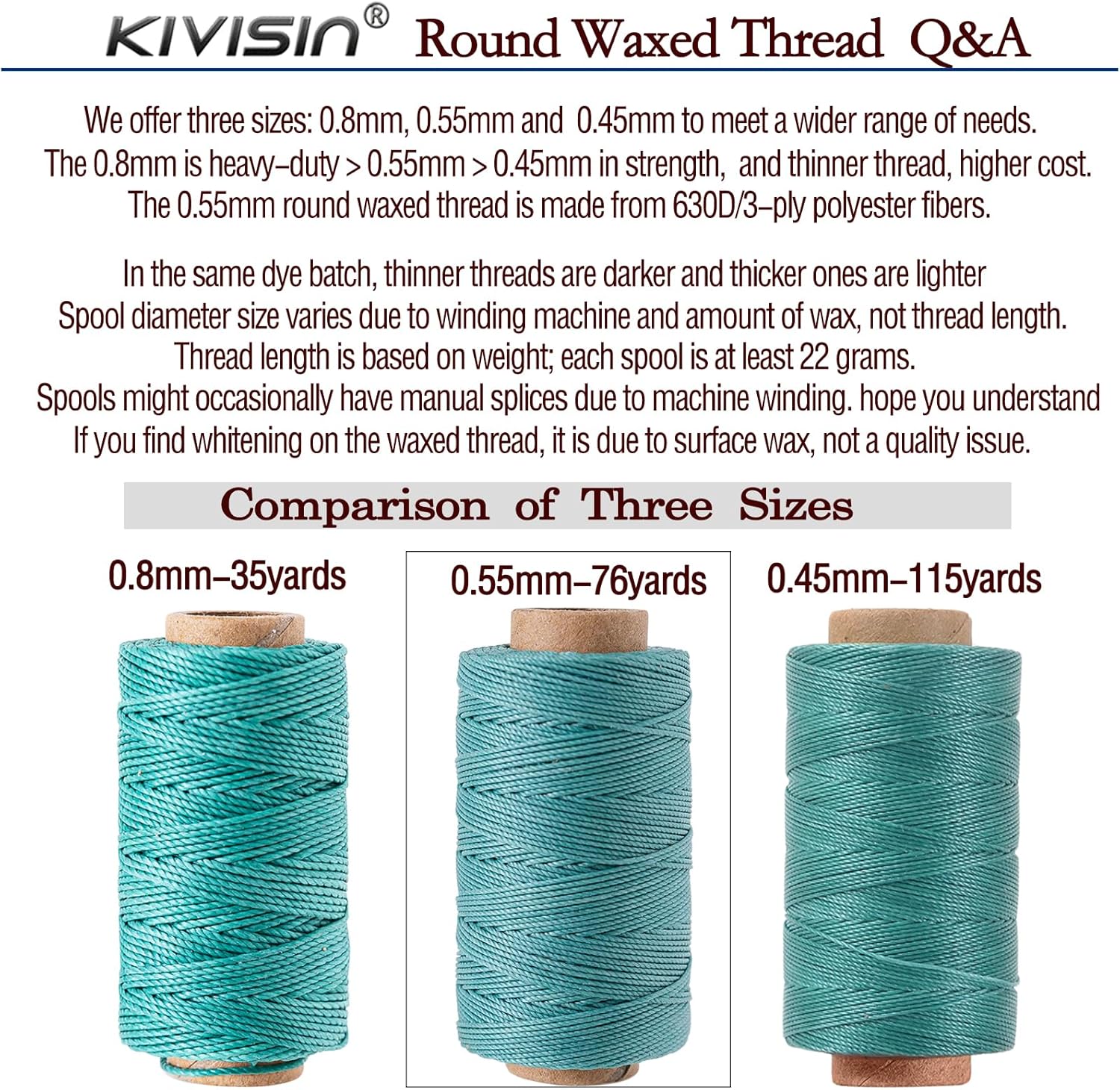 - Parameters – Bonded, twisted, dyed, and waxed 3-ply 630D polyester cord, 12 colors bright and vibrant, 0.55mm diameter, 70 meters / 76 yards / 230 feet each color, wound on paper spools, packaged in paper boxes with 7 pieces hand needles and threader