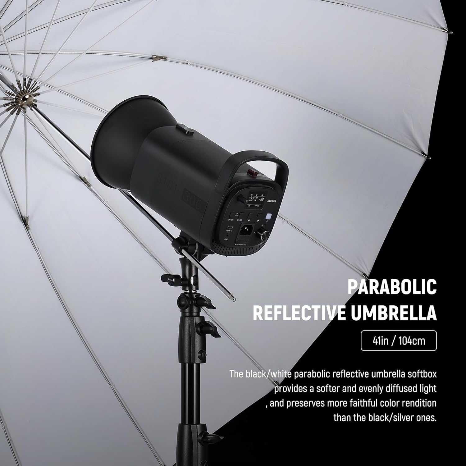 - 【41"/104cm Black/White Parabolic Reflective Umbrella】 This 41"/104cm deep parabolic umbrella softbox provides a softer and more evenly diffused light effect than the black/silver version, and preserves neutral color temperature for faithful color rendition. Perfect for group portraits or expansive landscapes. Its parabolic shapped design allow for a broader spread of light