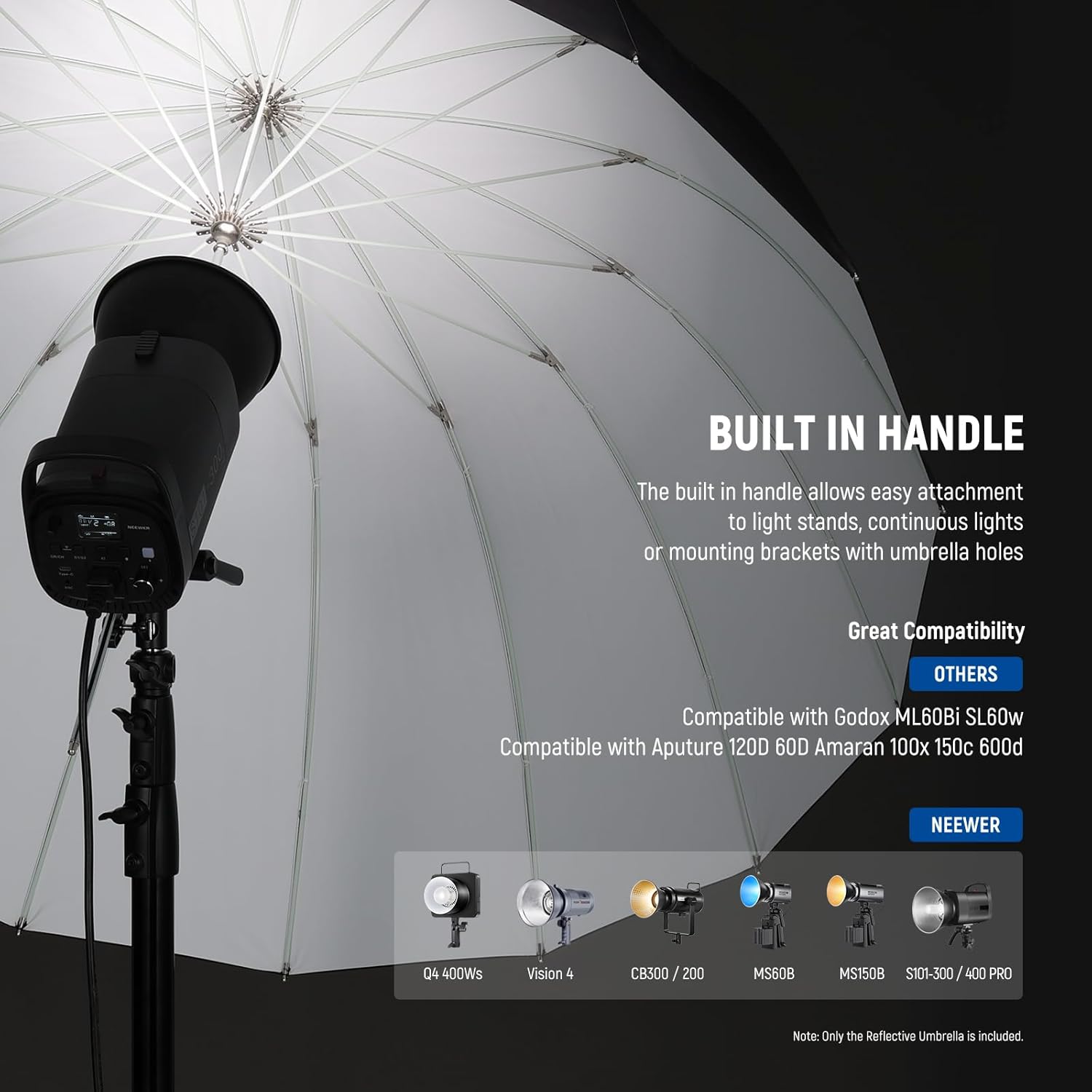 - 【Built in Handle】 The built in handle allows easy attachment to light stands, continuous lights, or mounting brackets with umbrella holes, compatible with NEEWER Q4 Vision 4 CB200B RGB CB60 MS60B MS60C MS150B S101-300W PRO/400W Pro flash strobes studio lights and continuous lights, compatible with Godox ML60Bi SL60w compatible with Aputure 120D 60D compatible with Amaran 100x 150c 600d etc.