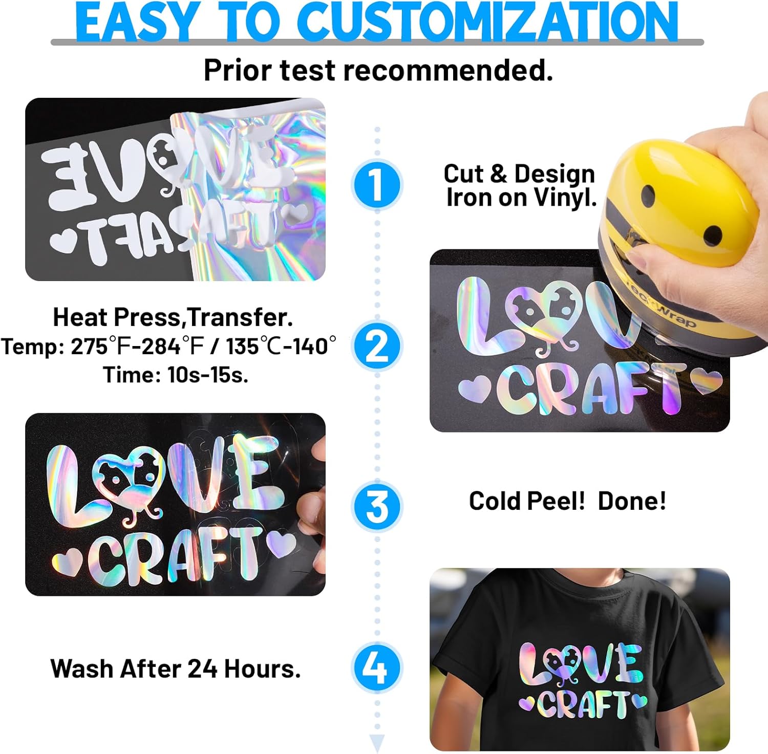 - Precision Cutting & Easy Application: Cut, weed, and apply effortlessly with our TECKWRAP heat transfer vinyl. For best results, simply mirror your design before cutting and apply with even pressure for 10-15 seconds at 275-300°F (135-145℃) using a heat press machine for T-shirts. Whether you're using iron on vinyl heat transfer vinyl or heat transfer foil, this easy process ensures flawless results every time. It’s ideal for applying intricate designs and iron on letters on various materials.