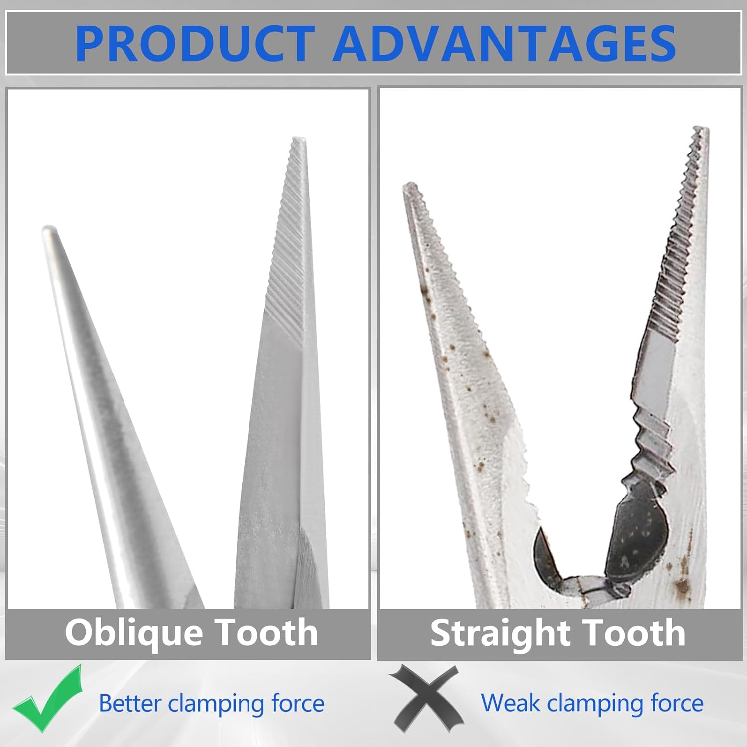 - 🛠Premium Materials: This needle-nose plier is crafted from strong high carbon steel, treated at high temperatures for high strength jaws that won't easily warp. They're also coated in an anti-rust material to prevent corrosion and extend their lifespan