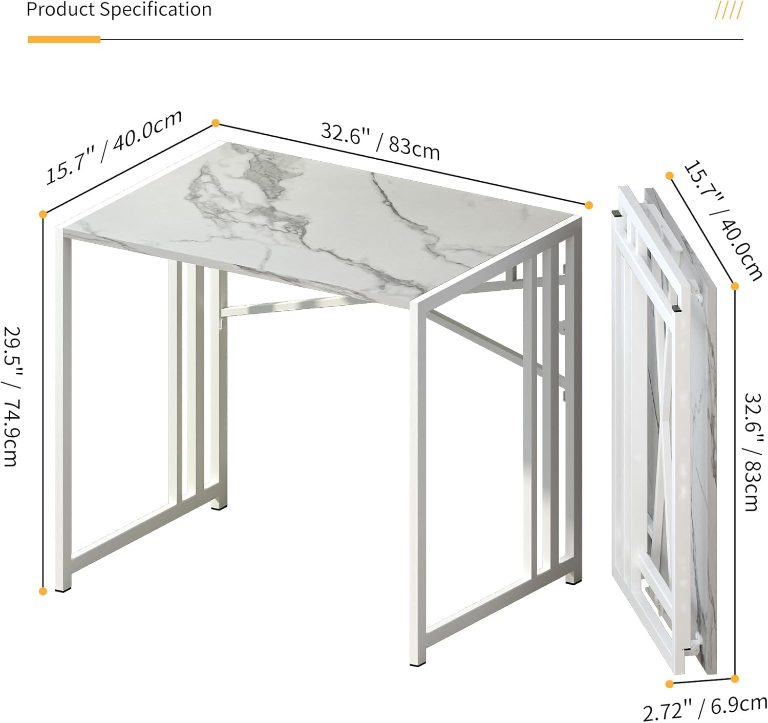 32 inch Folding Small Desk, Writing Gaming Computer Camping Desk for Small Spaces, No Assembly Required Home Office Desk, White Marble