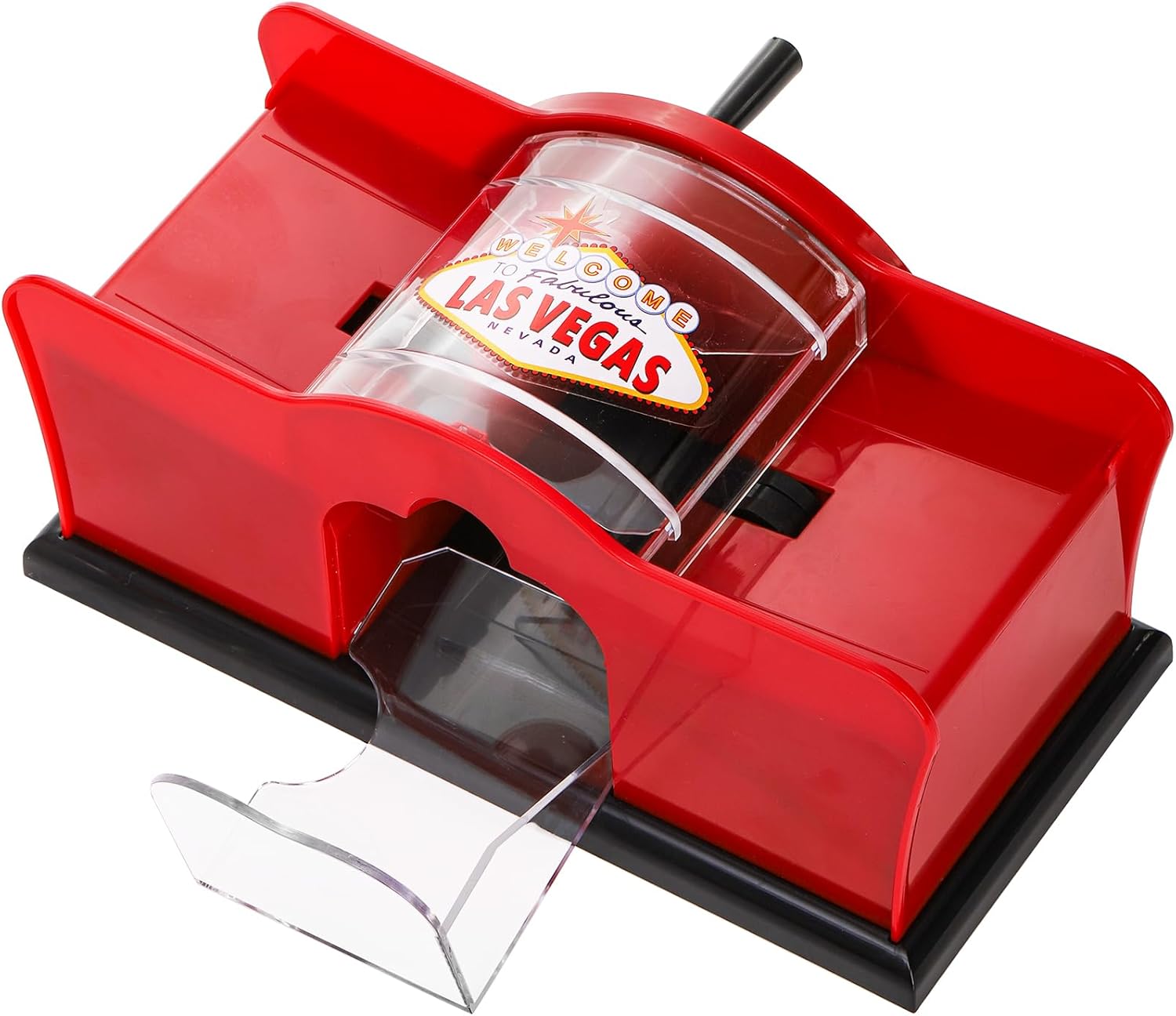 - Manual Card Shuffler: The size of the manual card shuffler are approximate: 9"L x 4.3"W x 4.25"H. It's lightweight and portable, and can handle up to two decks of cards at one time, ideal for both professional and beginner card dealers. (NOTE: Poker cards are not included, slightly turning the handle can easily shuffle the cards)